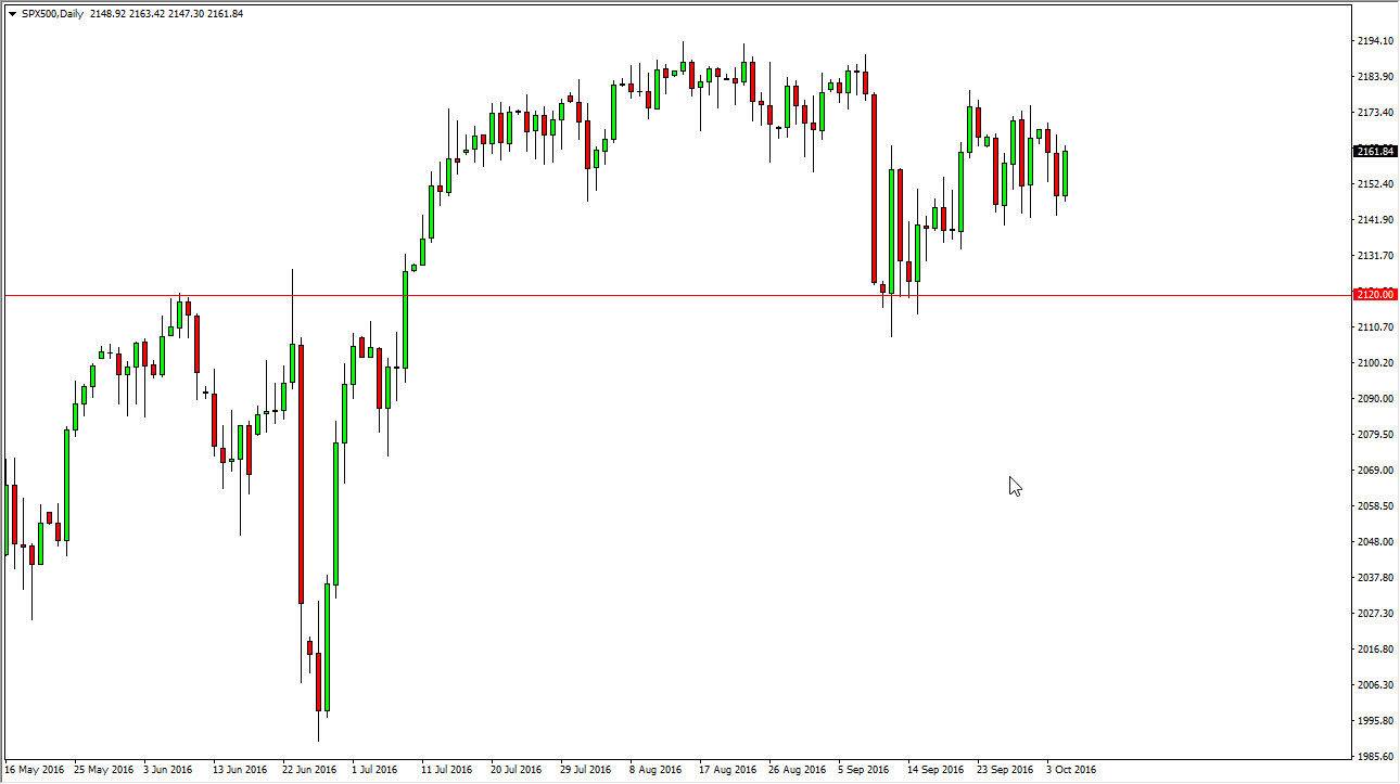 The S&P 500 rallied a bit during the course of the day on Wednesday, as we continue to bang around in this general vicinity. Larger picture, I think that we are trying to form some type of ascending triangle, or perhaps even a symmetrical triangle. I also think that part of the reason for the consolidation is that we are waiting for the jobs number on Friday. Ultimately, I think that we have a bit more of an upward bias longer-term, so pullbacks could offer buying opportunities. If we can break above the top of the ascending triangle, the market should then reach towards the highs yet again. Keep in mind that this is a low interest-rate environment, and that should continue to give a little bit of poignancy to this market.