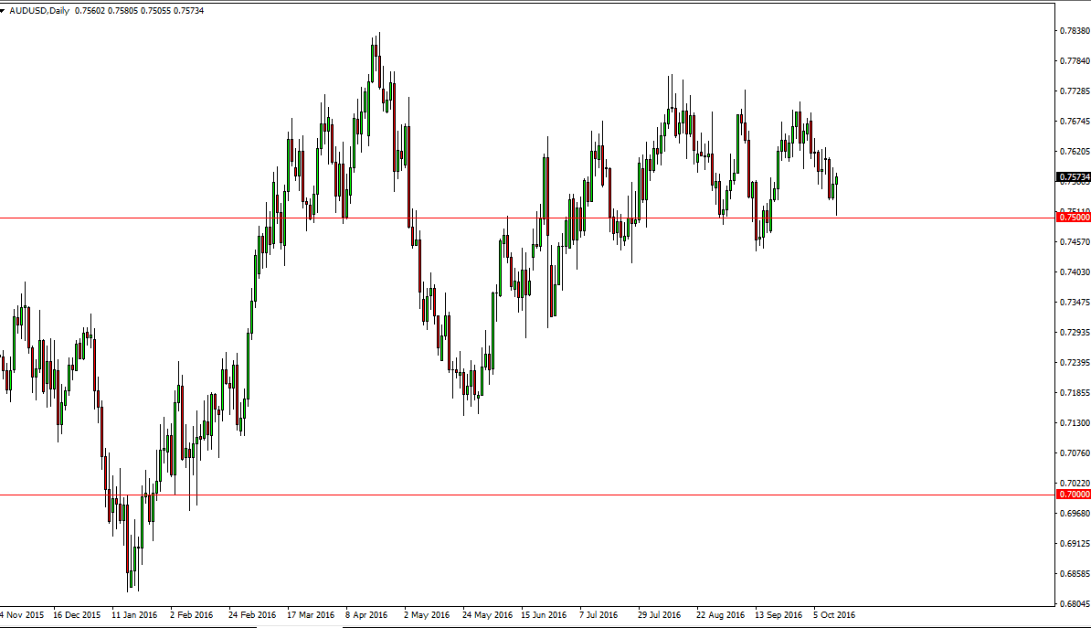 The Australian dollar fell during the day on Thursday, and rather significantly. However, we found in the support of the 0.750 turn things around for a bit of a hammer. The hammer, one of the most bullish candlesticks that you will see normally has buyers coming in. If we can break above the top everything we could grind our way back towards the 0.77 level above. That’s an area that is rather resistant, and I do not expect to get above there. The one thing that could change things is if the gold market start rallying rather strangely. Until that happens, I am a bit hesitant to get too involved in the Australian dollar but this is a relatively strong signal, so I believe that a short term buying opportunity may be presenting itself.