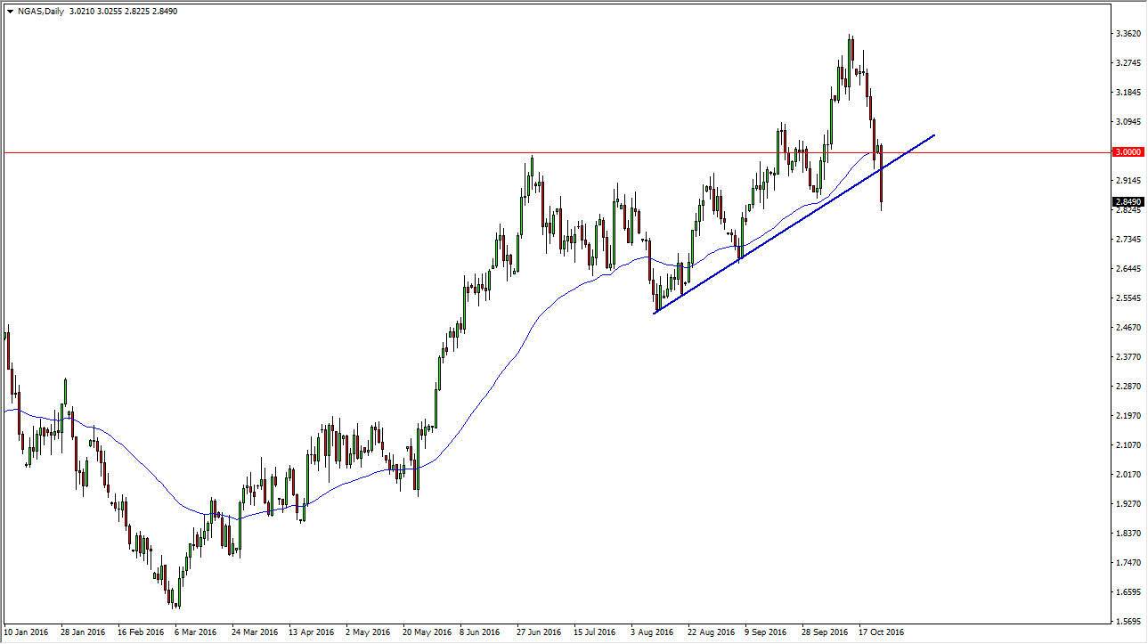 The natural gas markets broke down significantly during the day on Monday, as we sliced below the 50-day exponential moving average, the $3.00 level, and then finally the uptrend line that has been so reliable over the last month. With this being the case, I feel that the natural gas markets have finally broken down and are ready to change the overall trend. After all, the natural gas markets have a lot of overhead when it comes to concern, because quite frankly it’s likely that the markets will try to rally, but at the end of the day there is so much in the way of supply in the ground that it’s difficult to imagine that we would ever be significantly supported over the longer term as the United States and Canada both could essentially power the rest of the world for several centuries. Ultimately, this is a market that I think is coming to terms with the fact that perhaps the natural gas markets have gotten way ahead of themselves. A break down below the bottom of the range for the day should send this market down to the $2.65 level. Any rally at this point in time should have quite a bit of resistance above at the $3.00 level.