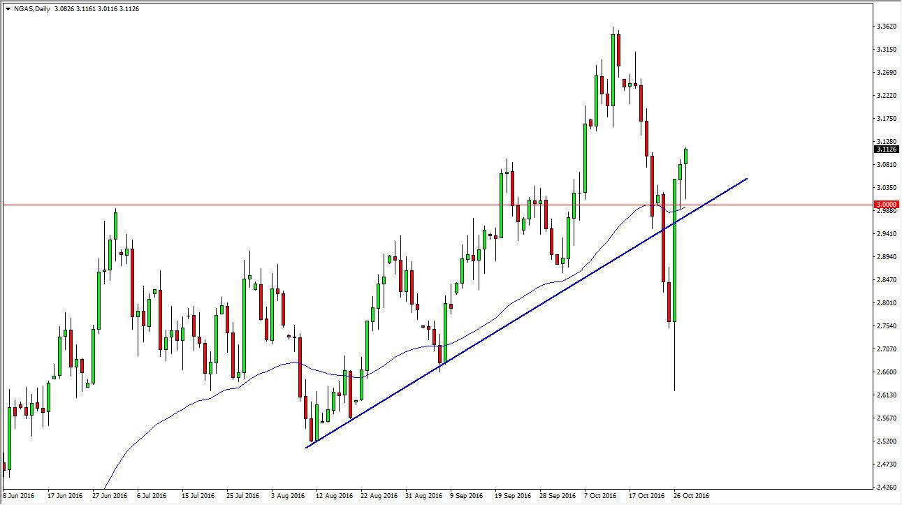 Natural gas markets of been a massive of the last several sessions as you can see, but during the Friday session we fell initially only to find support yet again at the 50-day exponential moving average and of course the $3 level. Because of this and the fact that we formed a hammer, I believe that the buyers are starting to take over again. There is a lot of noise in this market, see you will have to be able to deal with this type of volatility, but at this point in time, as long as we stay above the uptrend line that I have marked on the chart, it’s difficult to imagine selling this market. After all, the candle from Wednesday was absolutely brutal and resoundingly positive.