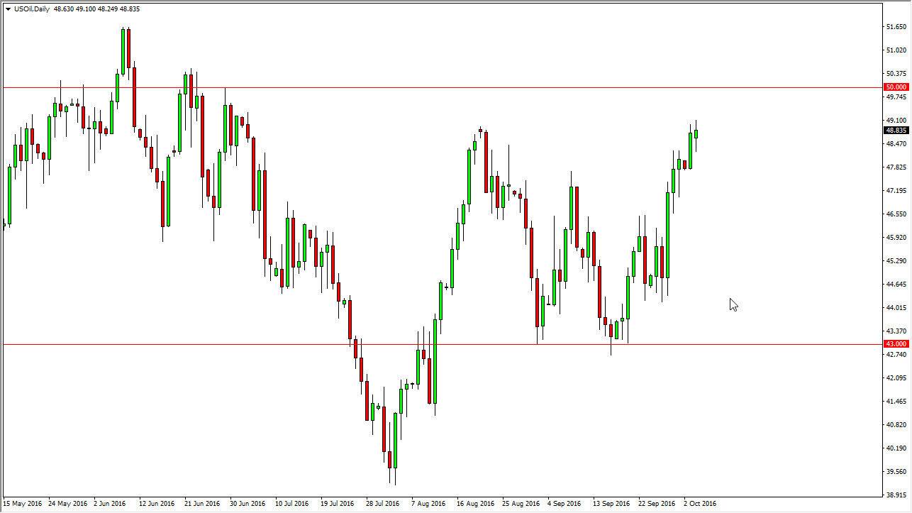 The WTI Crude Oil market went back and forth during the course of the session on Tuesday, as we continue to find quite a bit of momentum to the upside. However, we are getting close to some significant resistance and of course we have the inventory numbers coming out today as well. With this being the case, we have quite a bit of trouble above here and extending all the way to at least the $50 level just waiting to happen. If we can break down below the bottom of the candle for the day on Tuesday though, at that point in time I think we would continue to consolidate in this area and perhaps drop from current levels to the $45 level or so.