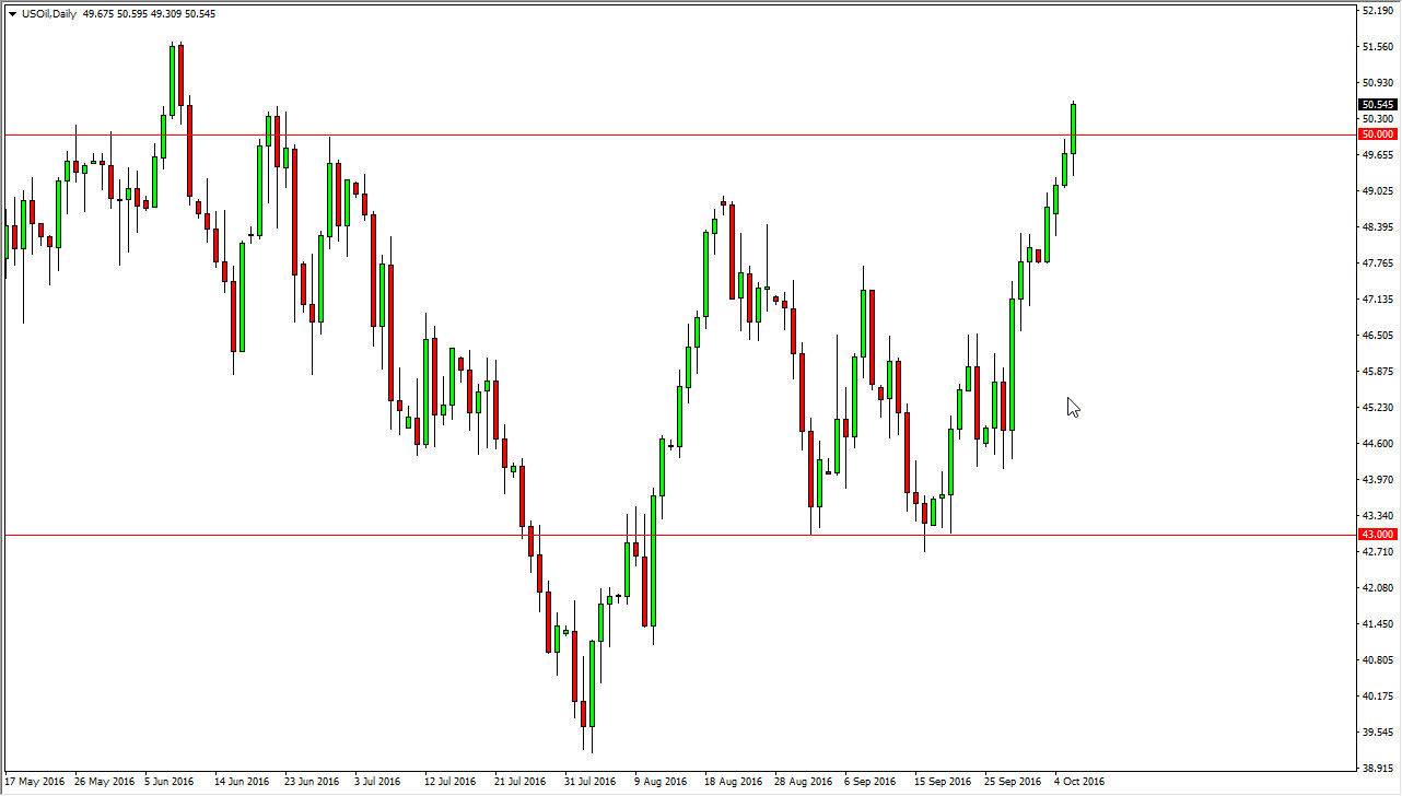The WTI Crude Oil market initially fell during the day on Thursday, but then watched itself above the $50 level. With this being the case, it looks as if the market is going to try to break out longer-term, but we have the jobs number coming out of America today. That of course can have a massive effect on this market, and it would not be a real stretch to imagine that this market is a bit overbought. With this, I suspect that any type of pullbacks at this point in time should be buying opportunities as this market continues to react positively to the OPEC announcement that the members were going to cut production. With this being the case, I think that it’s impossible to sell this market, and any pullback at this point in time should be a buying opportunity.