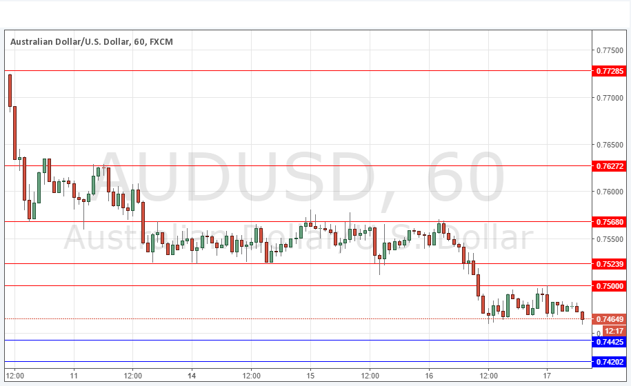 Go short following some bearish price action on the H1 time frame immediately upon the next touch of 0.7500 or 0.7524.