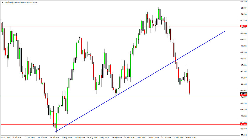 The WTI Crude Oil markets fell on Friday, slamming into the $43 level. This is an area that has offered significant support in the past, so I fully expect it to be fairly supportive now. However, we have closed towards the bottom of the candle and it seems like a breakdown is imminent. Below the $43 level I believe we will make a serious attempt to reach the $41 level, and then eventually the $40 level where I think a large amount of support is to be found. With this, I believe that short-term rallies will also offer selling opportunities on signs of exhaustion. The supply of crude oil on the month in the market is so quick far too strong for any OPEC led cuts to make a significant dent in currently.