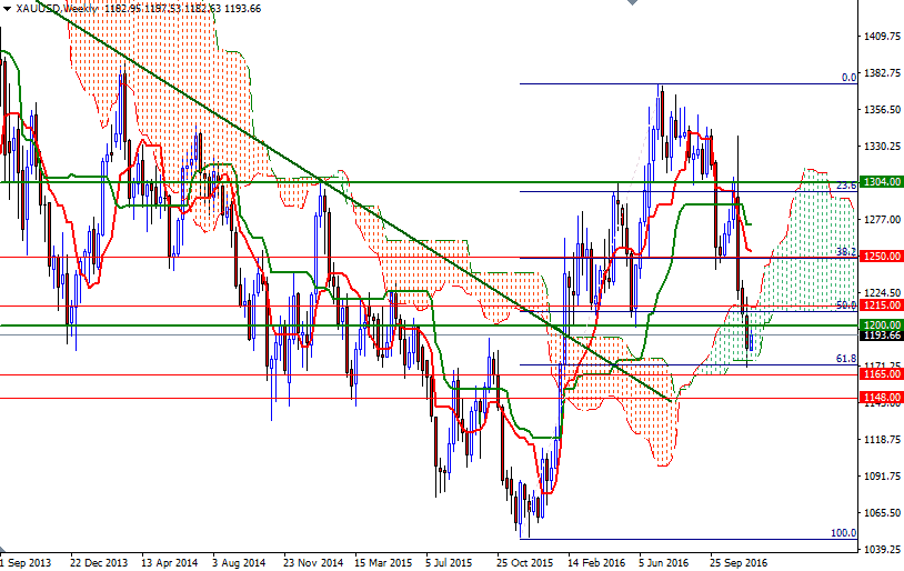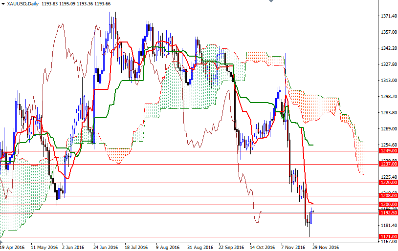 Gold prices ended Monday's session up $10.85, to settle at $1193.80 an ounce, as a drop in the U.S. dollar lent some support to the precious metal. The XAU/USD pair extended gains after breaking above 1292.50 but ended up finding a bit of resistance in the 1200-1197 zone. Apparently the market is finding some support from short-covering as some investors lock in gains ahead of key data releases from the United States.