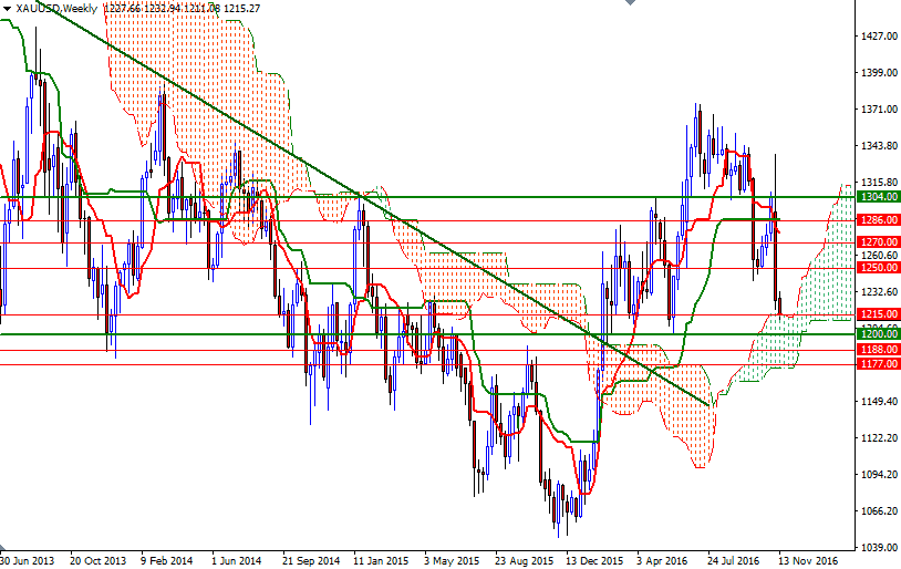 Gold prices fell $9.01 on Thursday as the dollar strengthened after comments by Federal Reserve Chair Janet Yellen bolstered the case for raising interest rates in December. Yellen said interest-rate increase could come "relatively soon". The greenback was also supported by better than expected U.S. economic data. The Labor Department said its Consumer Price Index increased 0.4% last month. A separate report showed that the number of people filing new claims for unemployment benefits last week dropped 19K to 235K, the lowest level since November 1973. The XAU/USD pair is currently trading at $1215.27, slightly lower than the opening price of $1216.