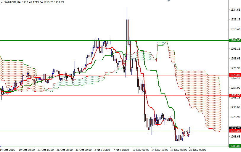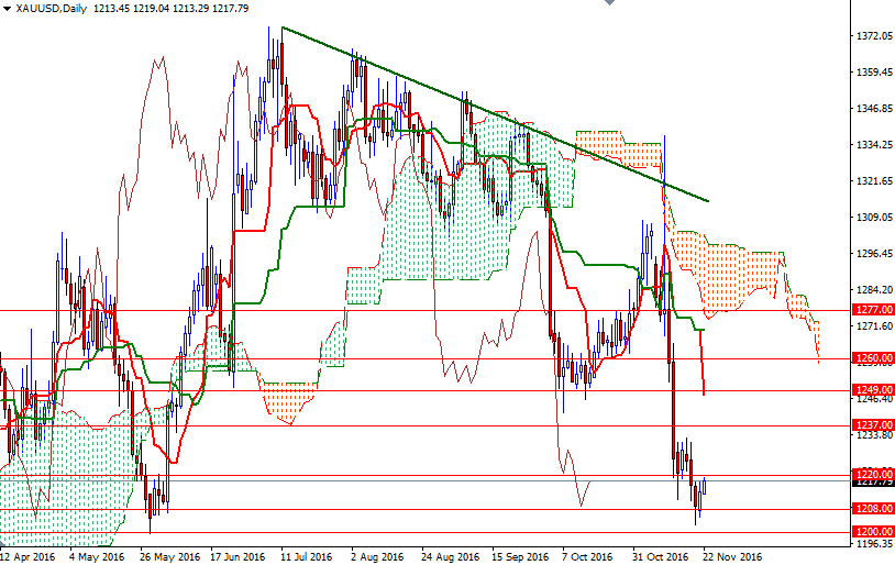 Gold prices rose $6.36 on Monday, recovering a portion of last week's losses, as the U.S. dollar retreated after rising for 10 straight days. Yesterday prices initially fell but found support at around 1206 which became the low of the day and also triggered some kind of a move up. The XAU/USD pair is currently trading at $1217.79, slightly higher than the opening price of $1213.45.