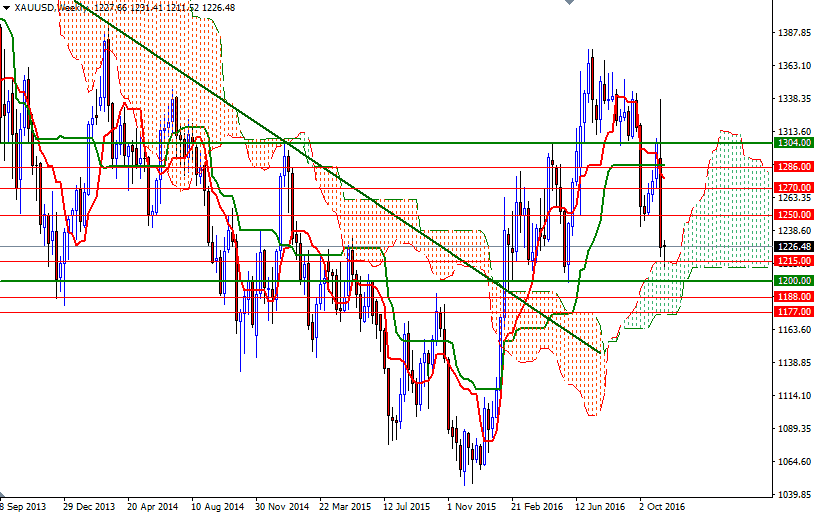 The short term technical picture remains bearish, with the market trading below the Ichimoku clouds on the daily and 4-hourly time frames. However, the weekly cloud sits right below the market and occupies the area between the 1215 and 1177 levels. That being the case, I think gold prices will tend toward consolidation for the next few days.