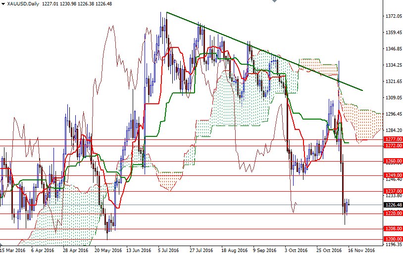 Gold prices edged higher on Tuesday, snapping a three-day losing streak, as a retreat in the dollar sparked some short-side profit taking. At the beginning of the week, the XAU/USD pair initially headed lower towards the $1210/8 zone but found enough support in the vicinity and managed to climb back above the $1220 level. Gold has dropped nearly 8% from last week's high of $1337.16 and is currently trading at $1226.48 an ounce.