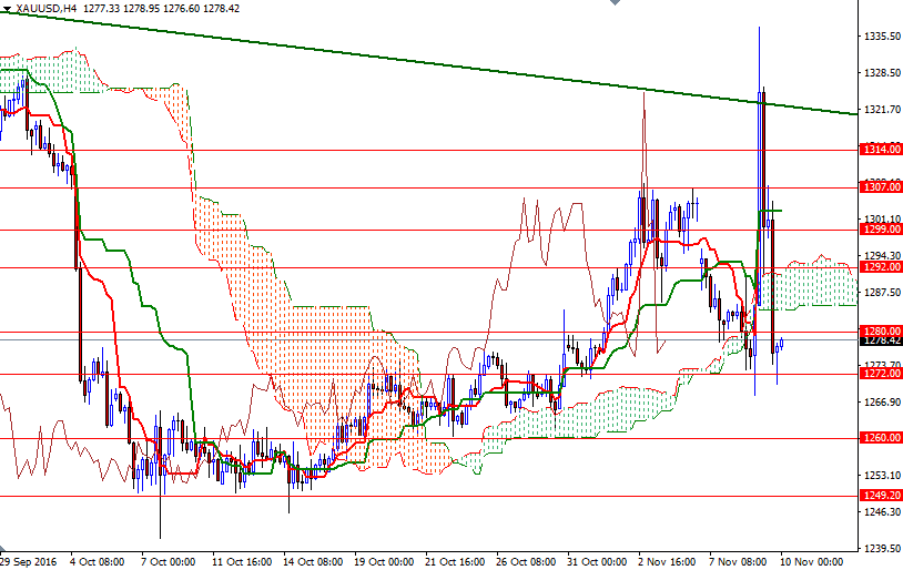 Although safe-haven bids pushed up gold prices to their highest level since September 27, the market erased gains as global stock markets recovered and investors digested Donald Trump's surprise victory, leaving a tall upper shadow on the daily candle. The dollar recouped losses after market participants turned their attention to a possible Fed rate hike, which is expected to happen next month. The XAU/USD pair is currently trading at $1278.42, slightly lower than the opening price of $1277.33.