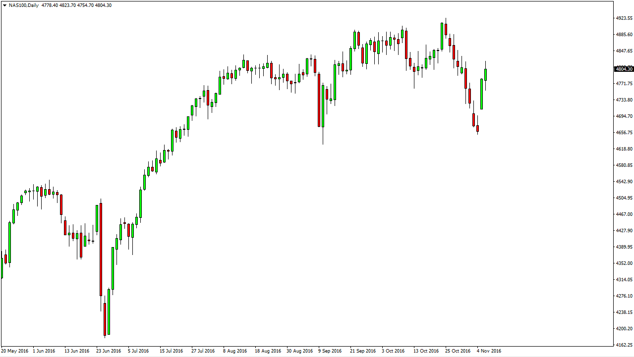 The S&P 500 had a very volatile session during the day on Tuesday, as the presidential elections obviously took center stage. At this point, one would have to believe that the markets favor Hillary Clinton, but there is a lot of noise above anyway. Because of this, it’s likely that the market will be volatile regardless of what happens, because as soon as the market stops looking at the election, and then must look at the fact that the US government will be stuck in gridlock going forward. Even if Donald Trump were to win, that would more than likely be the case as well.