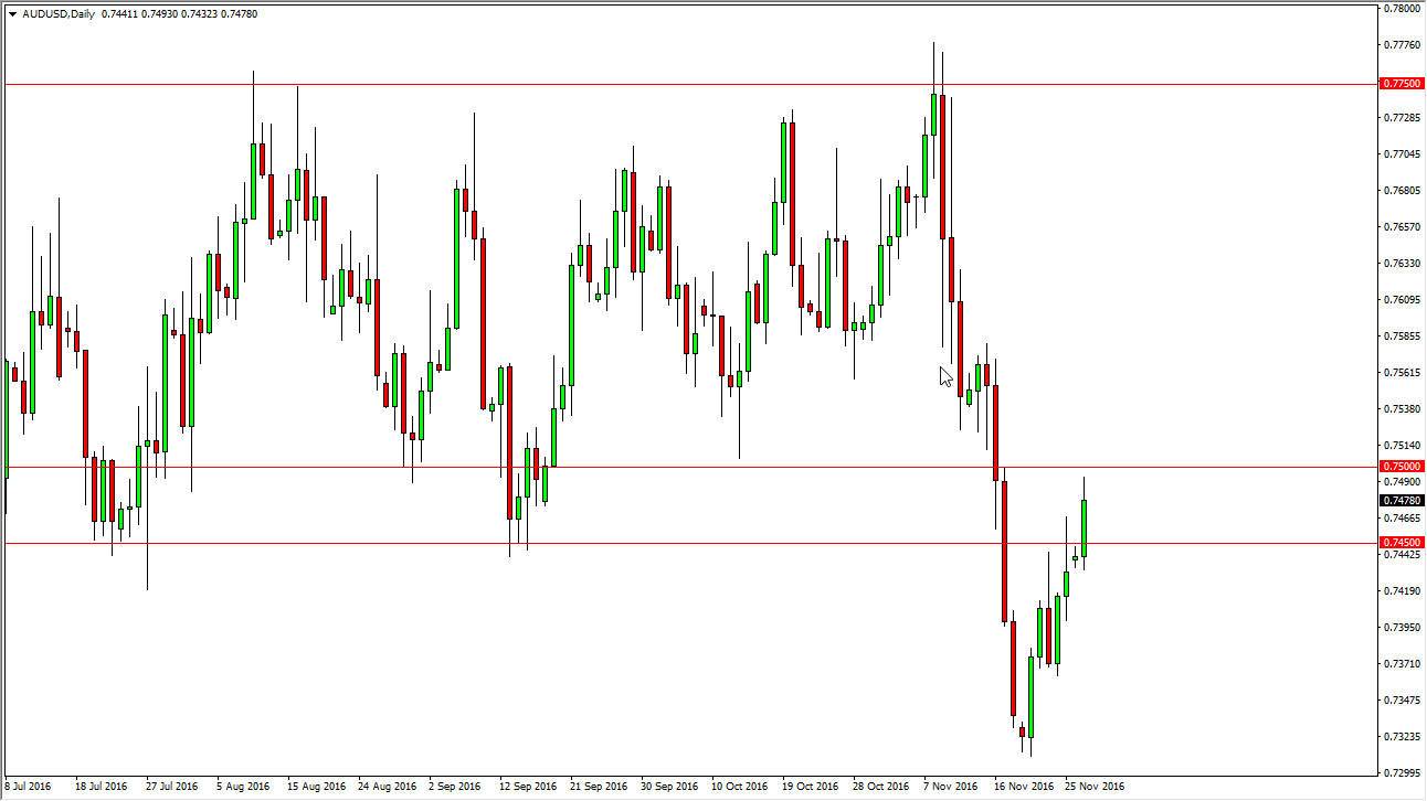The Australian dollar rallied on Monday, slamming into the 0.75 region. This is an area that should be massively resistive, and it makes sense we could not get above there. Ultimately, I think this is a market that will follow gold which seems to be sitting sideways in general. On short-term charts, restarting to see a little bit of a sell off, and if gold falls in line I don’t see the reason why we won’t pullback. There is a lot of noise just above the 0.75 handle, so even if we break out to the upside I would be fairly hesitant to get involved. What I would rather see as gold put downward pressure on the Aussie just as the US dollar will. Also, we have the quarter over quarter Q3 GDP numbers coming out of the United States and if there strong that could put quite a bit of bearish pressure in this pair also. When we break down below the 0.7450 level, the market will then reach towards the 0.73 level underneath.