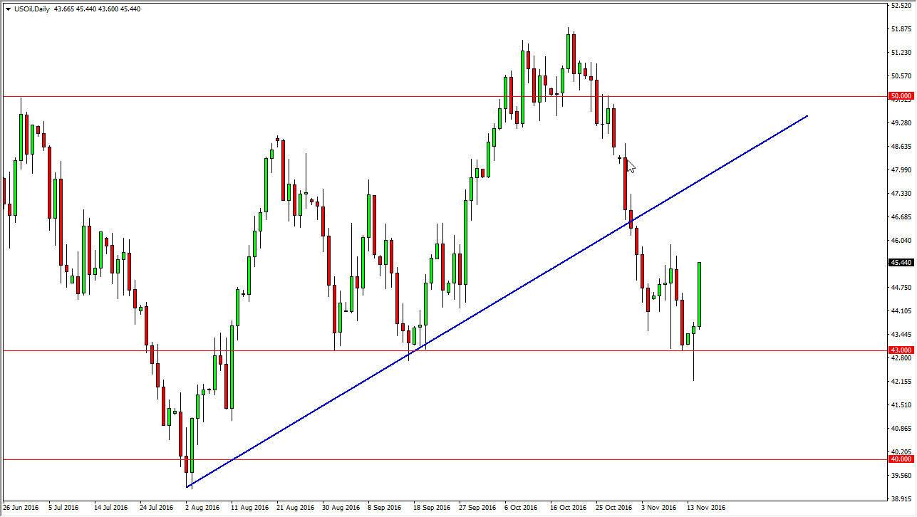 The WTI Crude Oil market exploded to the upside, breaking above the top of the previous sessions hammer. This of course is a very bullish sign and could extend to a much bigger run. However, I think we are starting to run into a significant amount of resistance near the $46 level, and of course the previous uptrend line. I believe that the area will cause quite a bit of resistance, so some type of exhaustive candle would be an excellent selling opportunity as far as I can see. This has been a very bullish candle though, see you have to keep in mind that we could see a little bit of continued momentum to the upside. I have no interest in buying this market as the Crude Oil Inventories number comes out today.