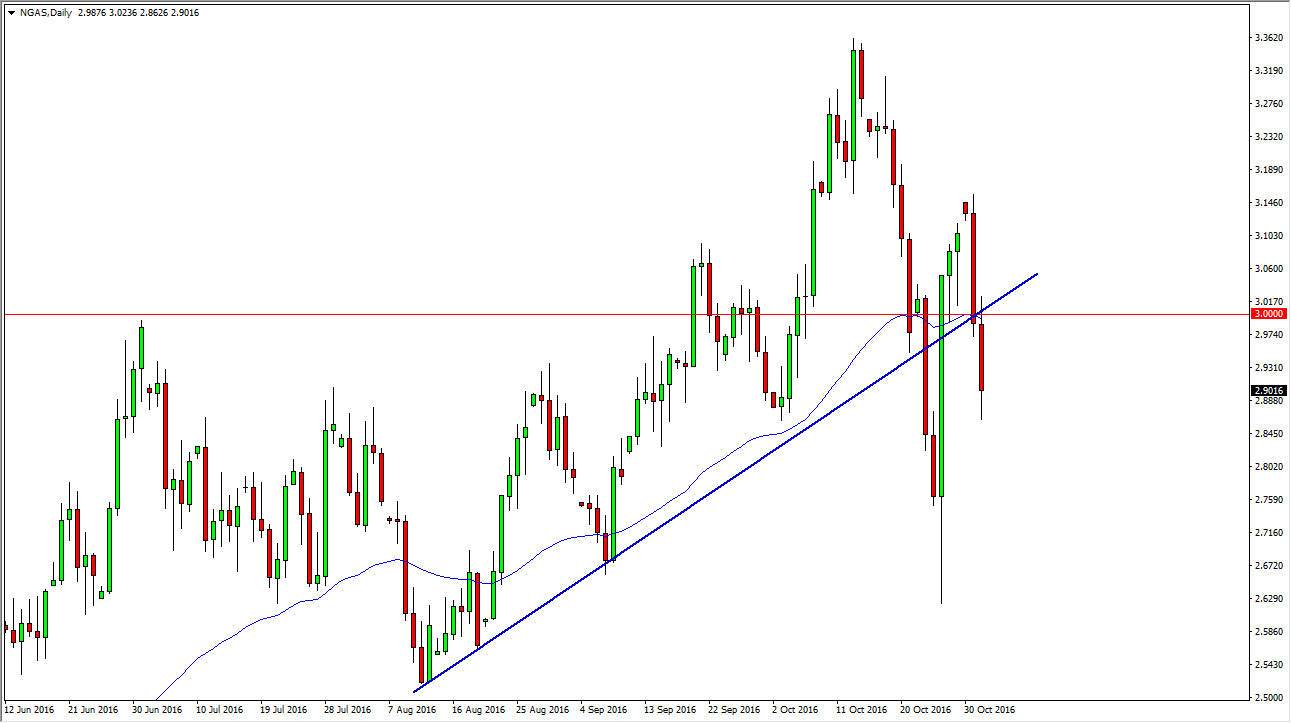 The natural gas market tried to rally initially during the day on Wednesday, but turned right back around at the $3 level as it is massively important to this market. We fell during the course of the day, and it now looks like we are going to continue to drop from here. I believe that the target is probably going to be $2.65 going forward, but the volatility of course has shaken a lot of players out of this market. With this being the case, as long as we stay below the $3 handle, I believe that you have to be short of this market, just as if we were to break back above the $3 level again, you would have to start thinking to go long again. Ultimately, this is a market that looks like it’s a bit overdone in both directions, so I think this is going to be a massively volatile market no matter what happens next, and as a result you may want to keep your position fairly small.
