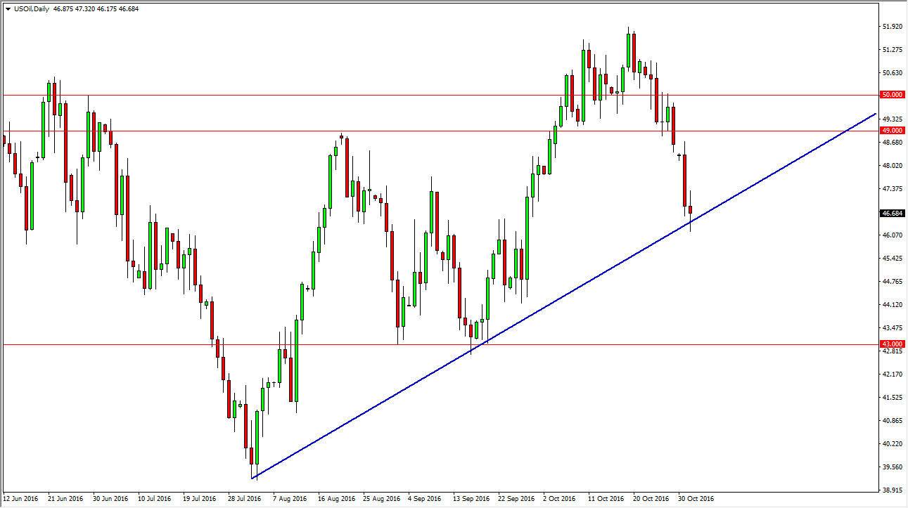 The WTI Crude Oil market went back and forth during the course of the session on Tuesday, as they ended up forming a fairly neutral candle in this market. We are sitting on top of an uptrend line, and of course we get the Crude Oil Inventories number coming out of the United States today, and that will have a massive effect on the market. If we can break above the top of the range for the session on Tuesday, I feel that the WTI Crude Oil market will continue to go higher, perhaps reaching towards the $50 handle. On the other hand, if we break down below the bottom of the range during the course of the session on Tuesday, we could very well continue to go much lower from there, perhaps reaching towards the $43 handle.