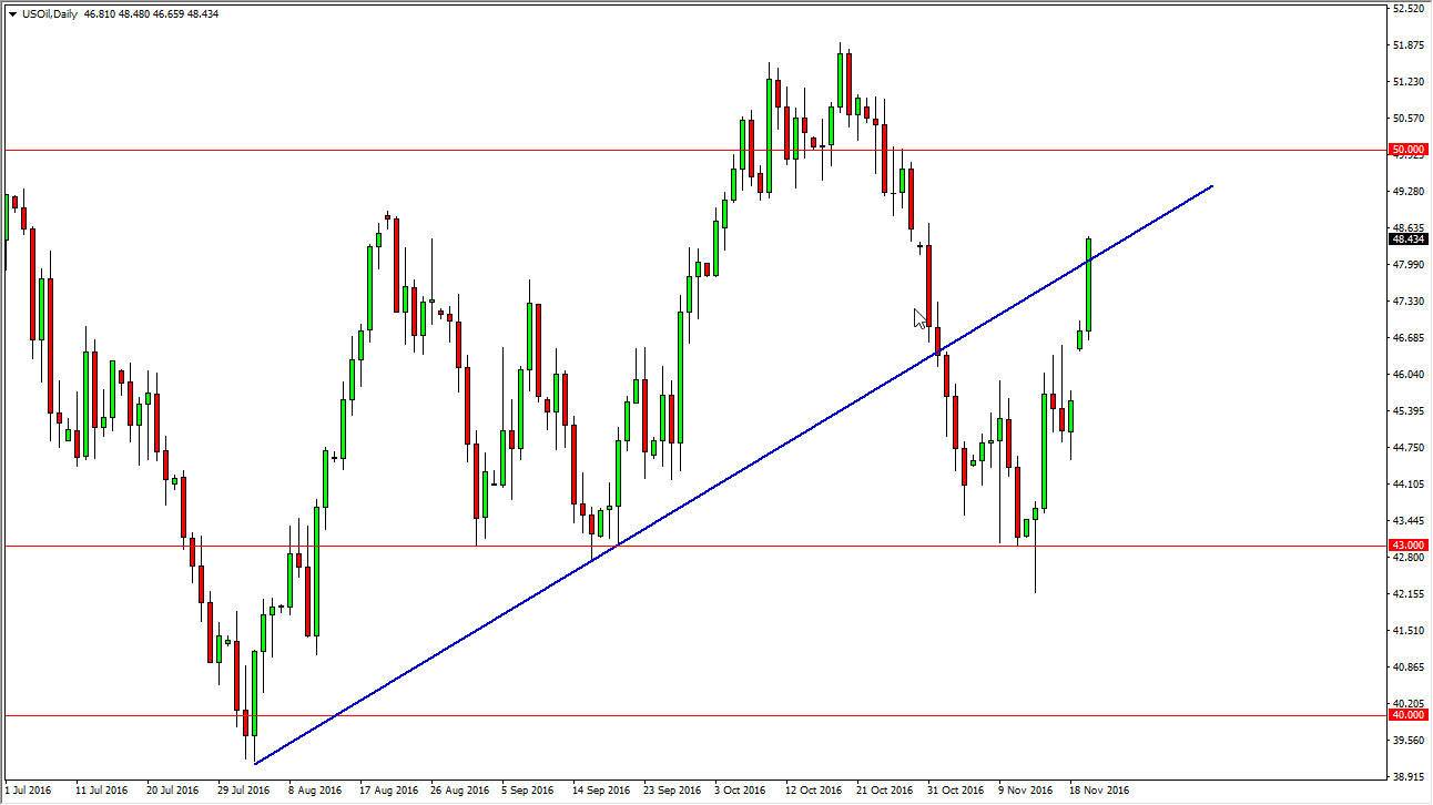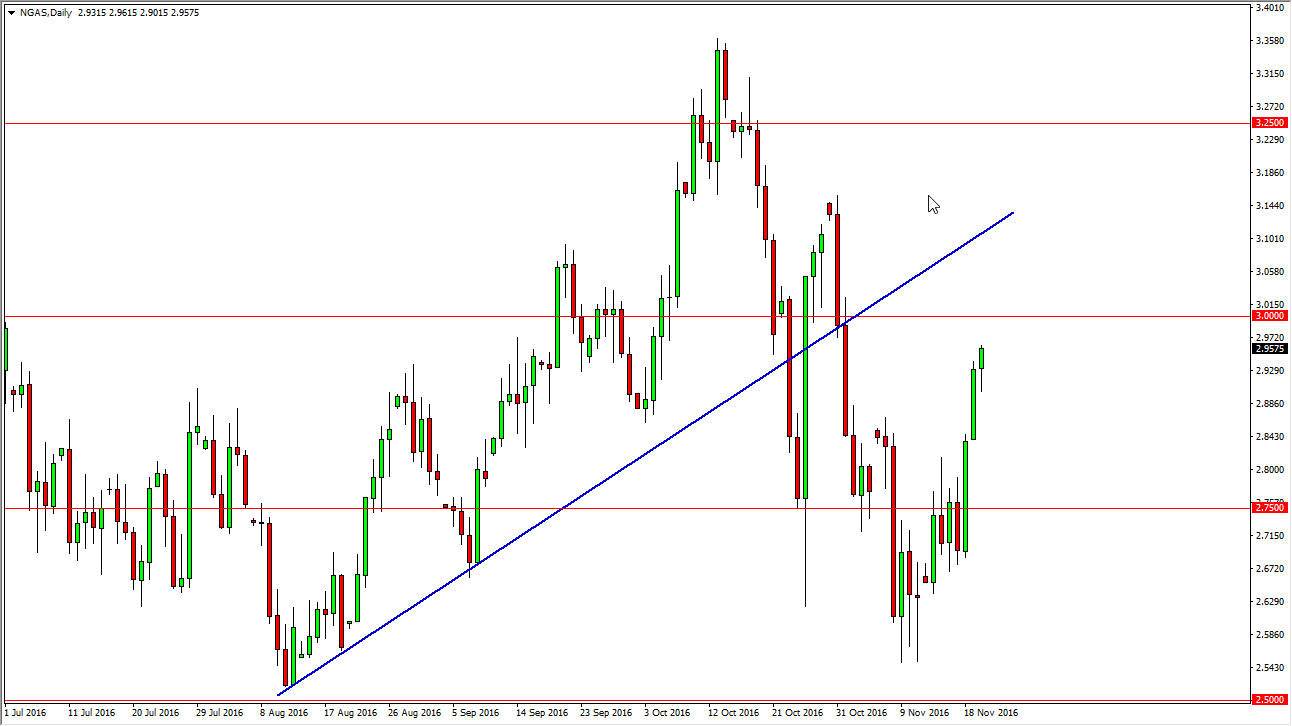 The natural gas markets initially fell on Monday but found enough support to continue the move higher. Energy in general had a strong day, but I also recognize that the $3 level above is psychologically resistant. The cold weather has arrived to the northeastern part of the United States which could bring up demand, but quite frankly we have so much in the way of supply that it’s difficult to imagine that the longer-term move will have any sustainability to it, as the demand won’t wipeout the massive amounts of supply. Also, you have the previous uptrend line that could offer resistance, so having said that it’s likely that the sellers will return given enough time, and I’m simply going to wait to see an exhaustive candle in order to start shorting again. I have no interest buying at this point.