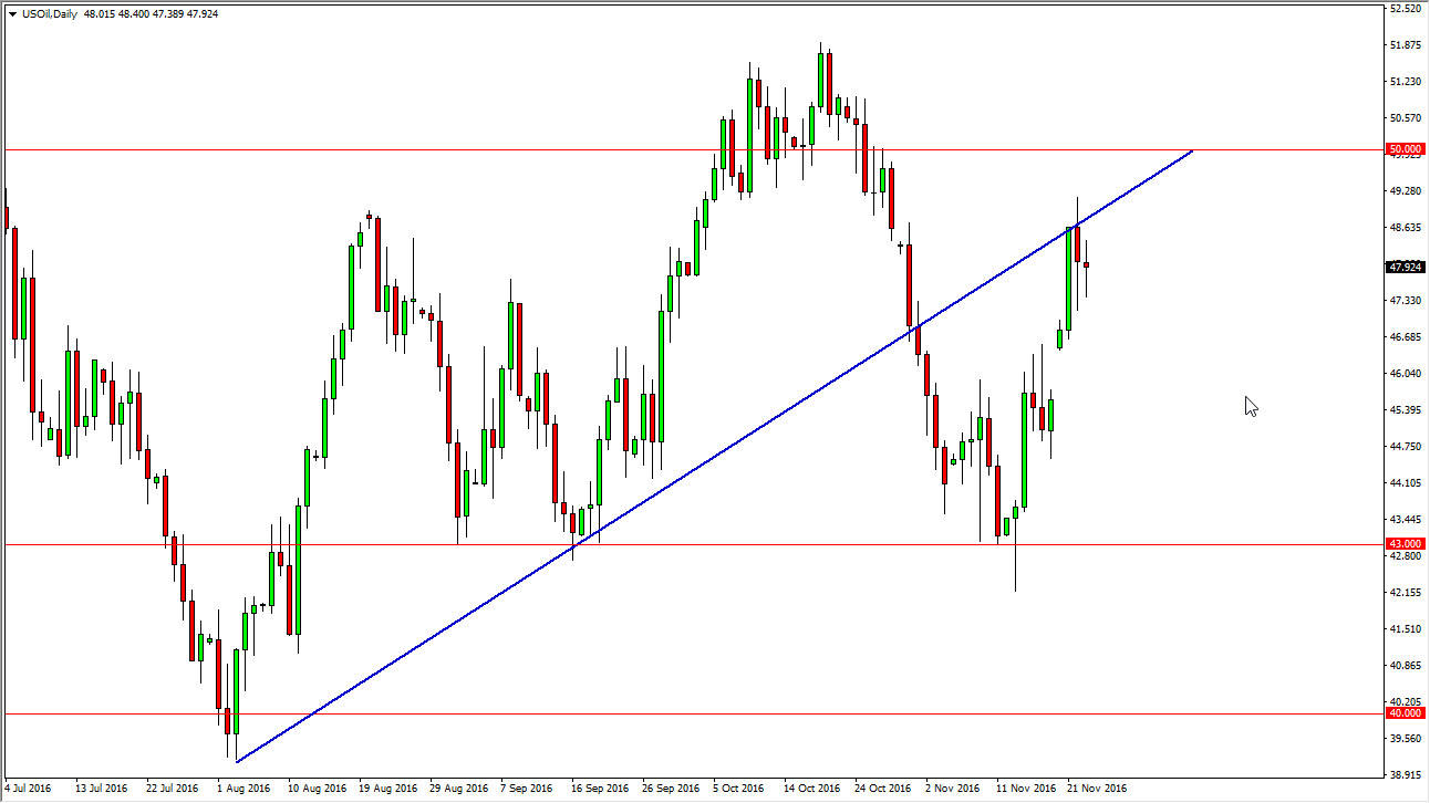 The WTI Crude Oil market went back and forth on Wednesday to show quite a bit of neutrality and as a result I think that the previous uptrend line is going to continue to offer resistance above. Because of this, I believe that it’s only a matter of time before sellers get involved and pushes market back down. The $49 level also offers quite a bit of resistance as well, and because of this I feel that it’s only a matter of time before we can search selling. If we can break down below the bottom of the candle for the Wednesday session, I think that the market will go lower to fill the gap as it typically will do. I have no interest in buying at this moment as there is quite a bit of reasoning to think that we will continue to go much lower.