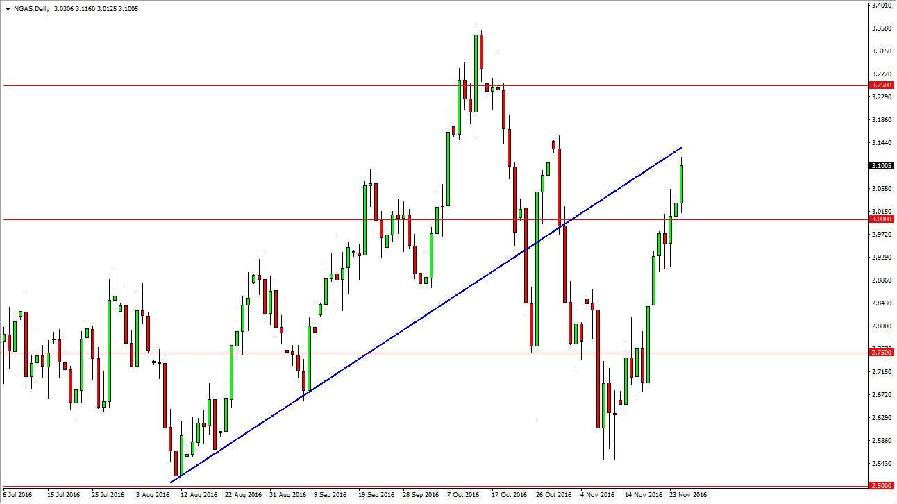 Natural gas markets had a positive session on Friday, as the colder weather has shown up in the northeastern part of the United States. The $3.10 level above has been resistive, so it be interesting see whether or not we can break above here. I also find it interesting due to the fact that we are overextended, and of course we are touching the bottom of the previous uptrend line which should now be resistive. On a bit on the sidelines when it comes to this market, because quite frankly I feel that it’s only a matter time before we turn right back around. After all, the market has collapsed several times after trying to rally, and with that being the case it’s likely that the sellers will continue to be very interested. The $3 level below could be supportive, but if we break down below there I think that the market will fall apart yet again. Either way, I think you can expect a very volatile market regardless what happens.
