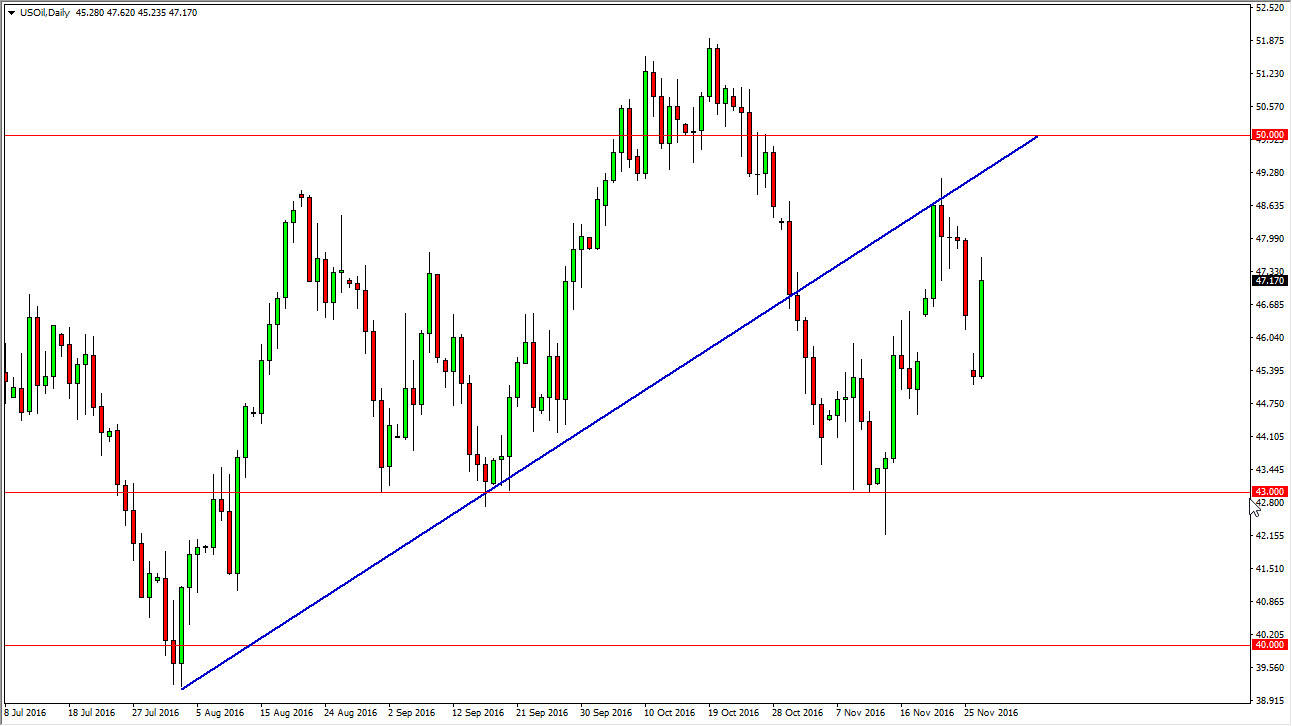 The WTI Crude Oil market initially gapped lower at the open on Monday, but then turned around to fill that gap completely. This is a market that has recently broken down from the previous uptrend line that should now be resistive, and of course there are a lot of concern in that area, and I believe it’s only a matter time before the market sells off. Shorter-term charts might be needed to take advantage of that, but the markets will be volatile as we await the results of any OPEC meeting. Ultimately, I do think there will be some type of agreement, but at the end of the day it won’t do much to take control of the oversupply issue that the oil markets had. This is a market that will revisit the $43 level given enough time, and I’m not willing to buy until we break above the $50 level, something that doesn’t seem very likely.