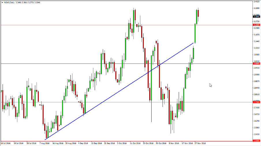 The natural gas markets fell on Tuesday, testing the $3.25 level. Ultimately, this is a market that is far too overextended to get involved with at the time, so even though we have pullback and showing bits of support at a round number, I’m very cautious about being involved. This is because even though a pullback is all but necessary, the reality is that you can’t short this market because at any time the buyers could return. Buying this market possible, but you need to do it on pullbacks and show signs of support as it gives you the ability to take advantage of what is obviously a very bullish explosive move to the upside. I can’t imagine selling at the moment, although it I do recognize that eventually the oversupply issue comes back to move the market.