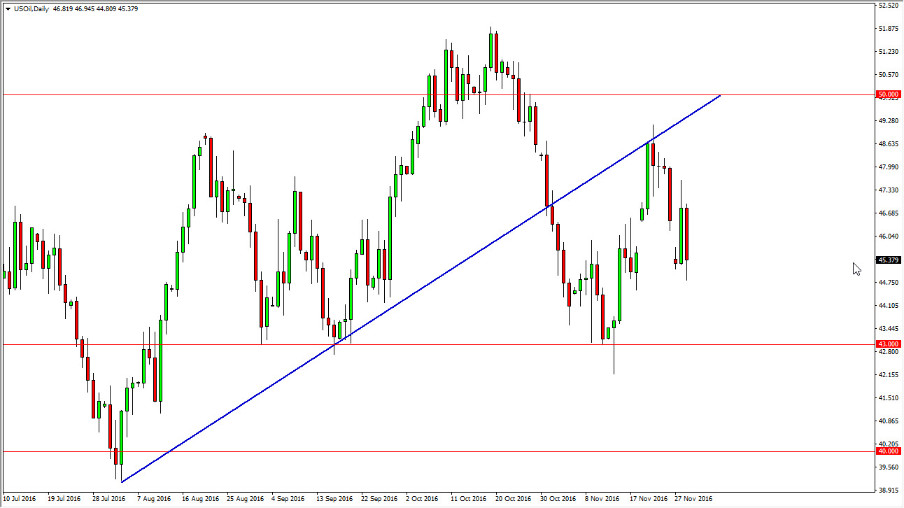 The WTI Crude Oil market fell during the day on Tuesday, wiping all of the gains from Monday. Because of this, looks like Reagan continue to be very volatile, and this market will probably be difficult to hang onto for any real length of time. I think that the bearish pressure will probably take over given enough time, because quite frankly we have far too much in the way of oversupply. I think rallies offer selling opportunities going forward, and with that being the case it’s likely that resistive candles will be the catalyst to start selling after those short-term bounces. The oversupply issue will continue regardless of OPEC cuts, because so many countries that are producing oil now have nothing to do with that cartel.