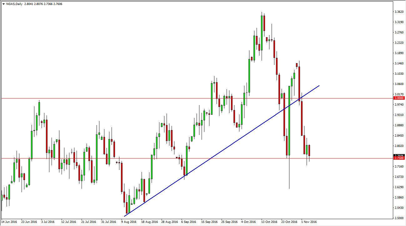 Natural gas markets fell during the day on Friday, testing the $2.75 level. We did not break down below it significantly though, so I think at this point we are just going to sit still or perhaps even bounce in order to build up more momentum to break down. Because of this, I’m waiting to see some type of exhaustive candle after a rally to start selling, or perhaps a break down below the bottom of the candle from the Thursday session to start selling. Have no interest in buying this market now, because even though we got a wicked bullish candle off of this general area, you can see that we have completely wiped out all signs of support from that candle above. In other words, this is a market that I believe goes much lower over the longer term which makes quite a bit of sense considering that demand is low and supply is so high. American drillers went back to work once the natural gas markets rose like this. Because of this, supply continues to climb.
