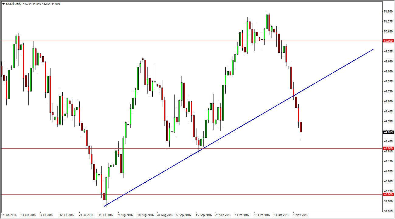 The WTI Crude Oil markets fell during the day on Friday, as we continue to see a serious lack of demand. However, I see a significant amount of support just below at the $43 level, so I do not anticipate that we will break down much farther in the short-term. If we rally, I think that is simply going to be a nice opportunity to sell the WTI Crude Oil market at higher levels. I believe that the massive uptrend line will continue to offer resistance now, so as long as we rally I’m looking for exhaustion to take advantage of. Keep in mind that the recent build in supply in the United States was almost 14 times what was expected. With this, I just cannot buy this market I look at rallies as opportunities here short again.