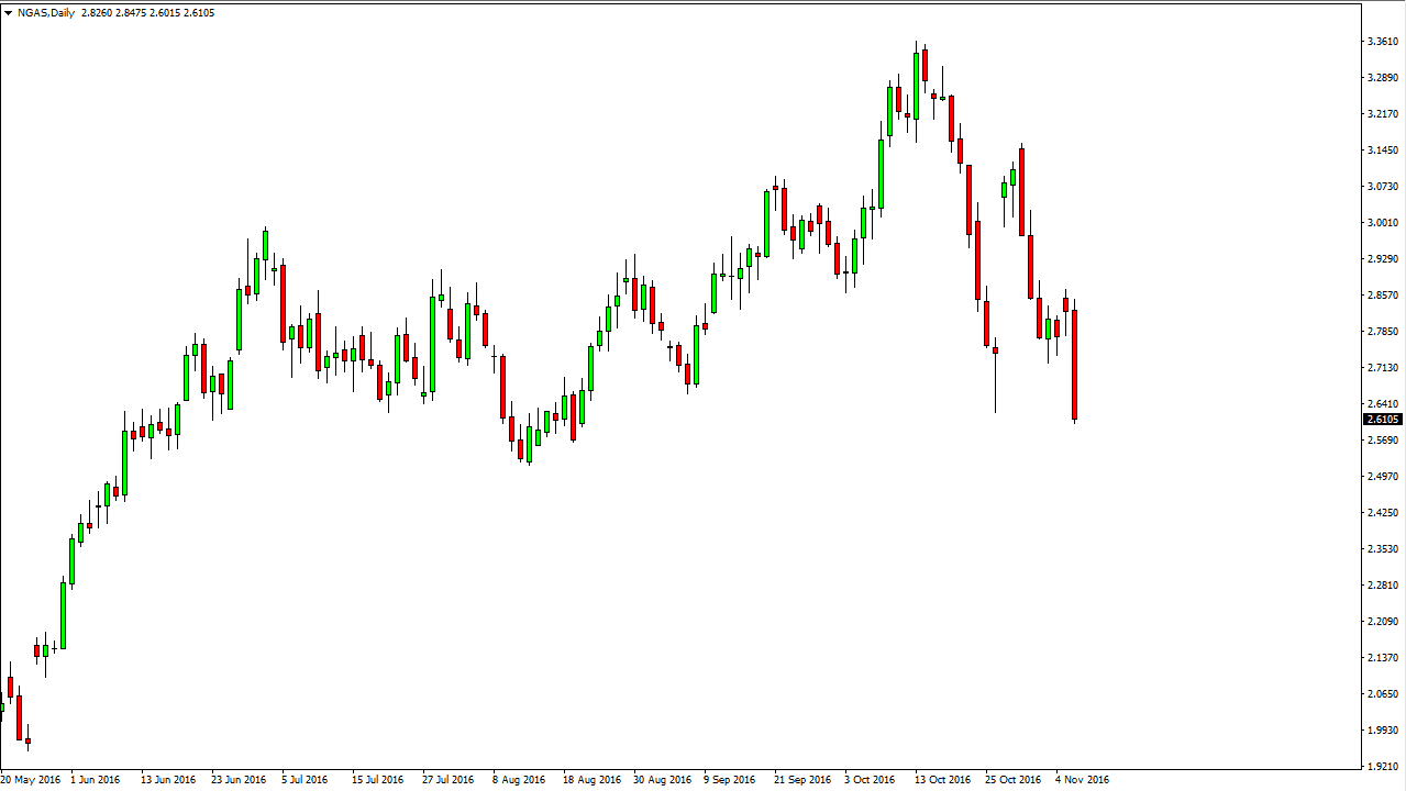 Natural gas markets had an extraordinarily bearish session on Tuesday, as we have sliced through the $2.65 level, which of course is a very bad sign. At this point, I believe that we are going to trying to reach the $2.50 level, but with the explosive moved to the downside I believe that we have to be cautious and wait for a short-term exhaustive candle after a rally to start selling. With this being the case, I believe that there is no scenario in which you can start buying the natural gas markets. Quite frankly, I feel that any rally at this point in time would simply be a “relief rally” at best.