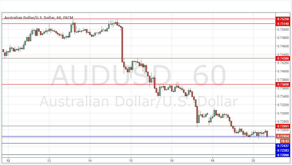 I wrote yesterday that although the action was looking bearish, the area between 0.7269 and 0.7228 was likely to be very supportive in the short-term. So far, I am wrong, as although the price was held up it now seems to be poised to advance down to 0.7228 and possibly 0.7200 beyond that. It may be that 0.7244 holds as support, and if the price mostly remains above there for the next day or so it will be a bullish sign.