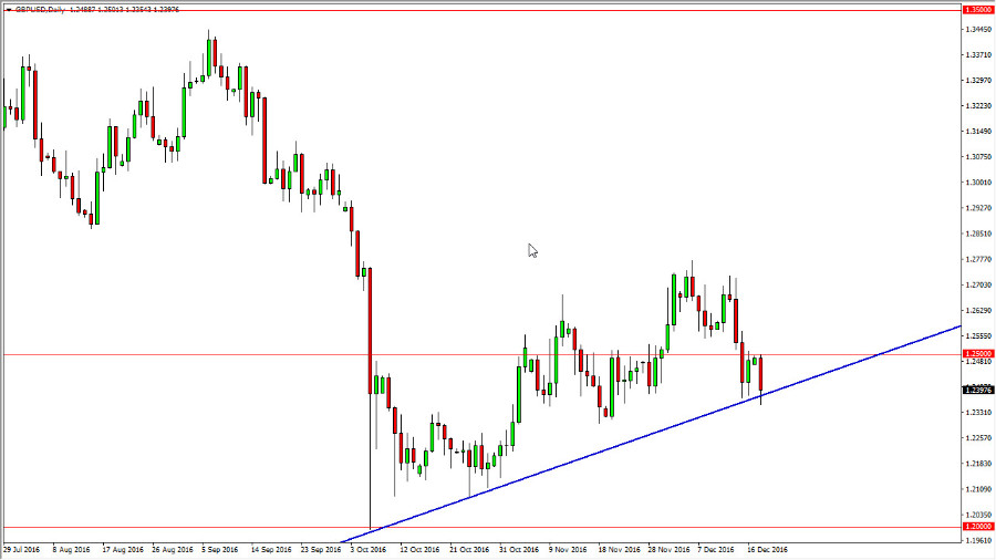 The British pound fell on Monday, and momentarily pierced the uptrend line that had been holding the market higher for some time. I believe given enough time we should continue lower though, as the US dollar has the benefit of several interest-rate hikes coming down the road. The Bank of England of course has a lot of concerns when it comes to longer-term health of British markets and economic sectors, after the exit vote that we have recently seen. Because of this, a break below the bottom of the candle has me start selling this pair to reach towards the 1.20 handle.