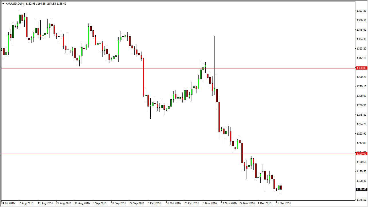 Gold markets had a slightly negative session on Tuesday, as we continue to bounce around the $1160 level. I believe that there is a significant amount of support, at least psychologically, at the $1150 level. It looks as if the market may try to bounce from here, but as you can see, every time we have rallied recently, the market has ended up selling off. I think that the $1200 level will continue to be resistive and essentially the “ceiling” in this market, so until we break above there I don’t have any interest in buying this market as the gold markets will continue to be influenced by the US dollar, and more importantly the interest-rate policy of the Federal Reserve. As the interest-rate in the United States goes higher, it takes less of those US dollars to buy gold.
