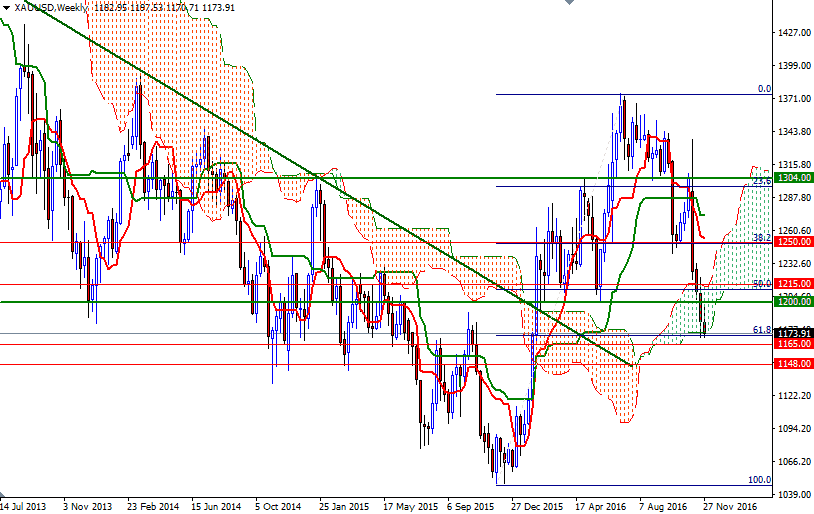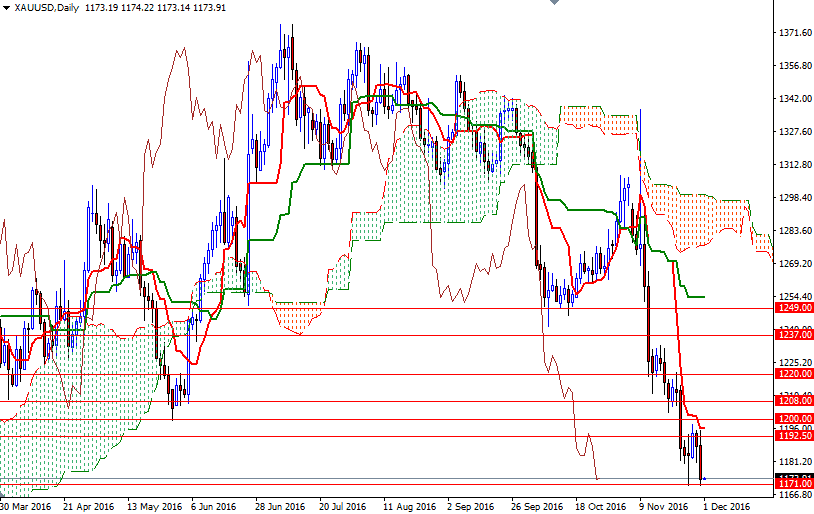 Gold prices settled at $1173.17 an ounce on Wednesday, suffering a loss of 8.14% over the month. The XAU/USD pair, which hit the highest level since September 27 following Donald Trump's surprise election, tumbled as investors unwound bullish bets. The precious metal lost roughly $165 an ounce from the post-election high on the back of the sharp rise in U.S. bond yields and burgeoning appetite for riskier assets. As a result, the monthly candle left a long upper shadow and ultimately ended the month just above a key support zone.