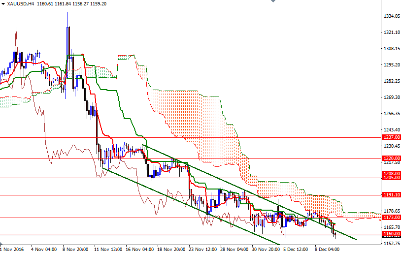 Trading below the weekly, daily and 4-hourly Ichimoku clouds indicates that the downside risks remain. We also have bearish Tenkan-Sen (nine-period moving average, red line) - Kijun-Sen (twenty six-period moving average, green line) crosses almost on all time frames. If the XAU/USD pair can't recover quickly and climb back above 1165/0, the market will have a tendency to visit the 1148/5 region which stand out as an obvious key support. But of course, in order to reach there, the bears have to drag prices below 1154/3. It is quite possible that XAU/USD will continue its bearish tendencies if the 1148/5 support gives way. In that case, 1138/4 and 1123 will be the next possible targets. To the upside there will be hurdles such as 1173/1 and 1182/79. Closing beyond 1182 could lead to short-covering and consequently we could see a test of the 1191/88 zone. Penetrating this barrier cloud could prolong the bullish momentum and open a path to 1197/5. Once above that, we could see a push up towards 1208/5.