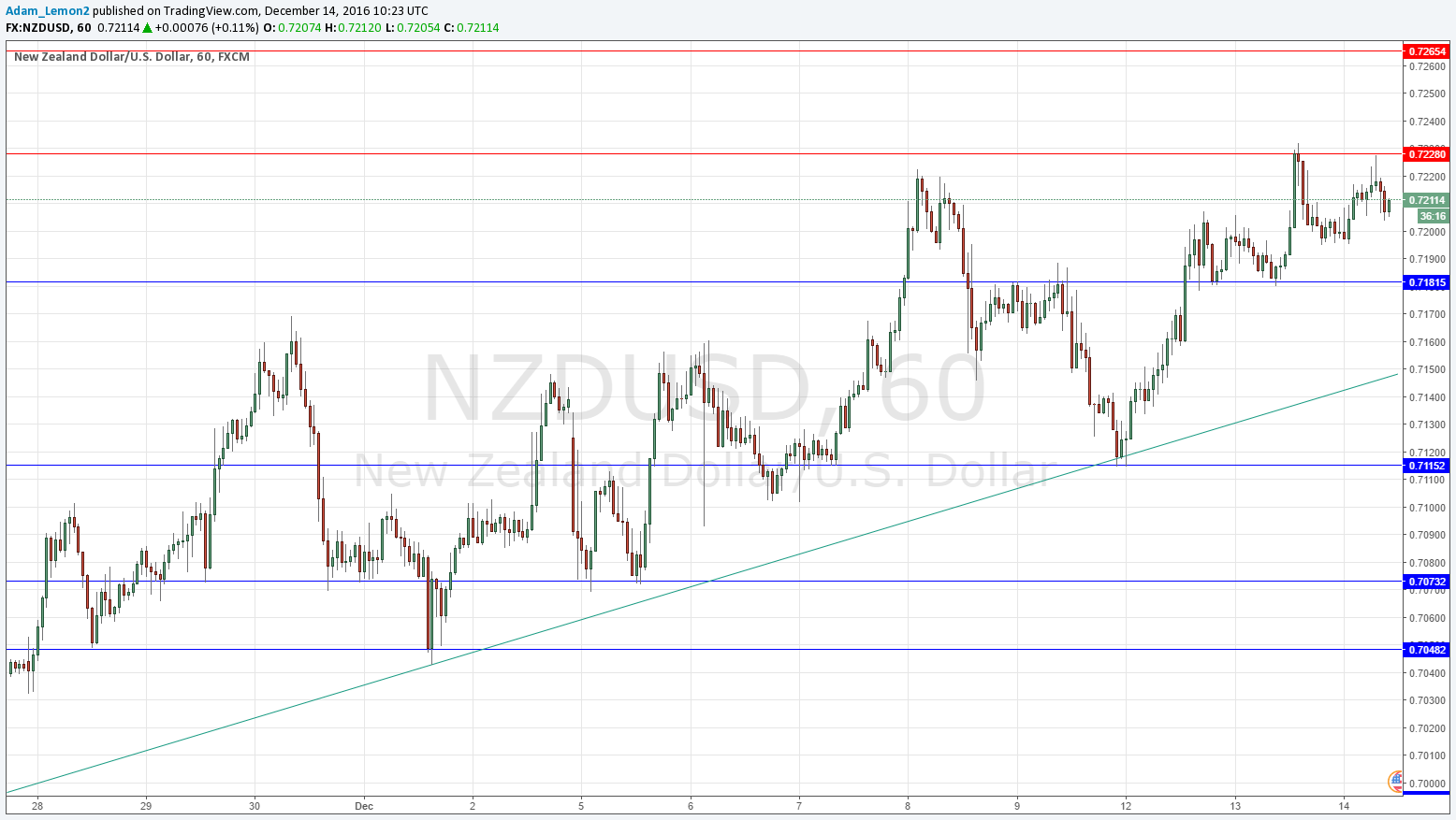There has been a rejection of resistance, but no meaningful change to the overall picture which is still bullish. If for any reason the USD is seen weaker after the important Federal Reserve announcements later, this pair should break up past that level at 0.7228, and reach the next level at 0.7265. Alternatively, the announcement could spike the price down as far as the bullish trend line, where it would probably look like a good buy.NZDUSD