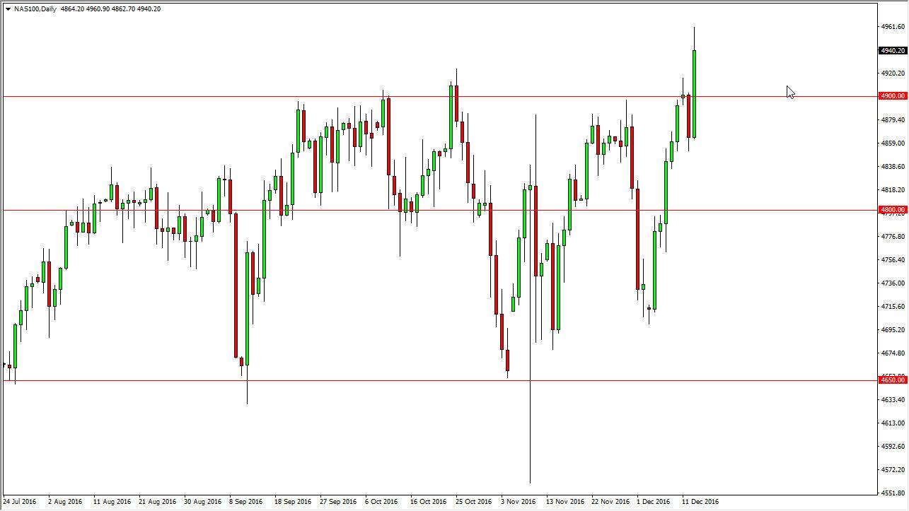 The NASDAQ 100 finally broke out on Tuesday, as the 4900 level gave way. It now looks as if we are going to continue to go to the 5000 handle above. The 5000 level above is a large, round, psychologically significant number, and as a result it’s likely that the pullbacks from time to time will be nice buying opportunities. The 4900 level below is essentially the “floor” in this market, and because of this I feel that the market will not break down below there again. Anytime we reset area, I also have to believe that there are people out there that have missed the rally looking to get involved.
