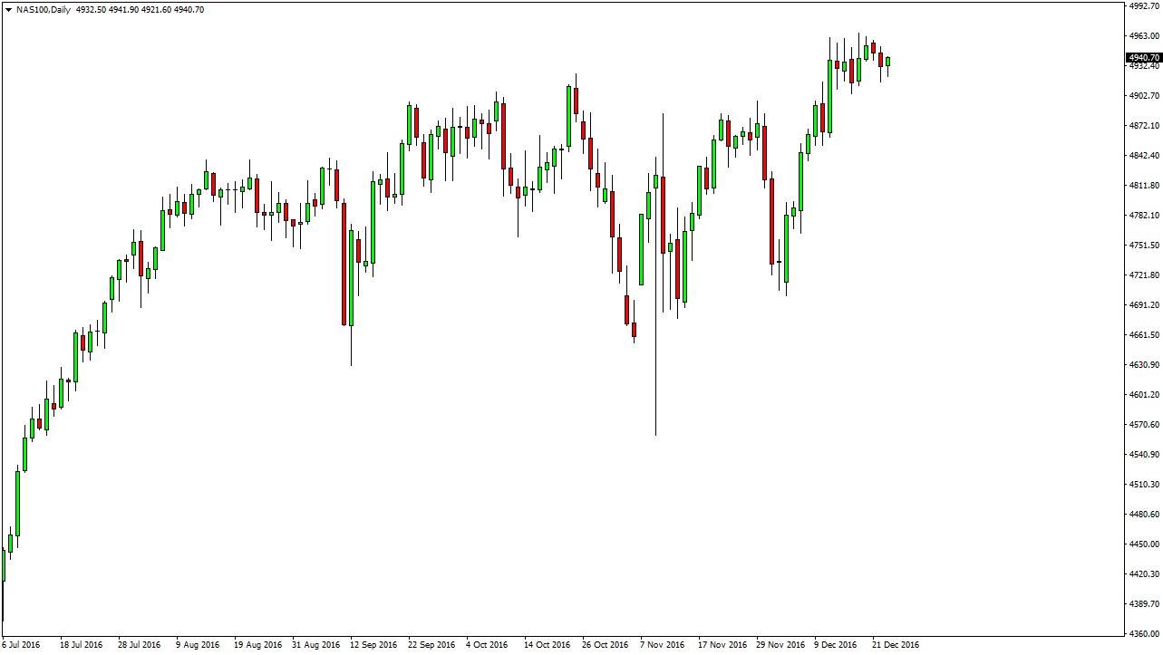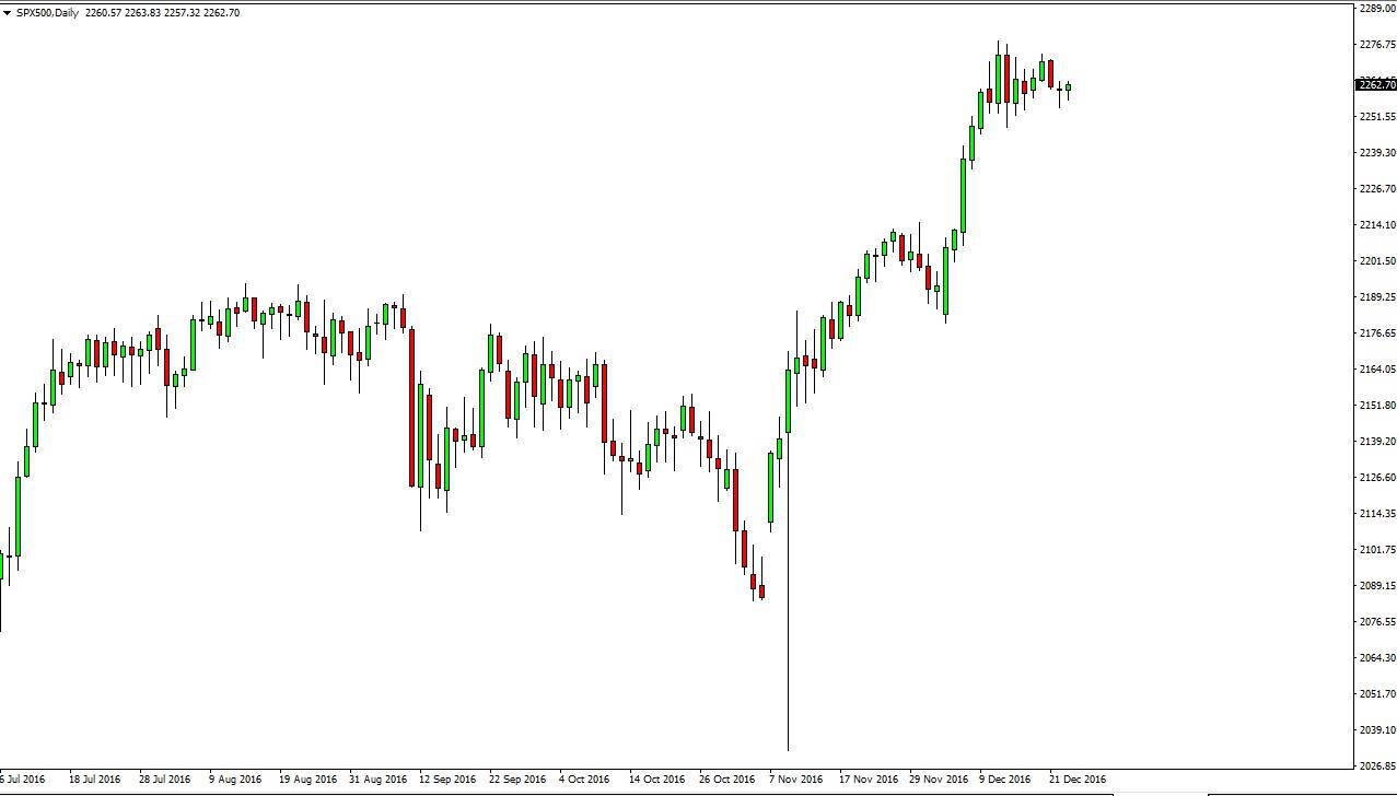 The S&P 500 had a quiet session on Friday as one would expect, as traders will have been thinking more about Christmas than putting money in a risky position. However, as we go through the holidays it appears to me that we may have short-term buying opportunities from time to time. I recognize that with the banks being on holiday today, it can be difficult to find any type of liquidity in this market. However, this is not change the analysis as I believe the 2250 level underneath offers quite a bit of support that the market will continue to respect. CFD markets could find the buyers at lower levels, awaiting the trading of the underlying S&P 500 once the market opens back up. This being the case, I think we’re going to bounce around with a slightly upward bias and then eventually break out after the holidays to the upside.