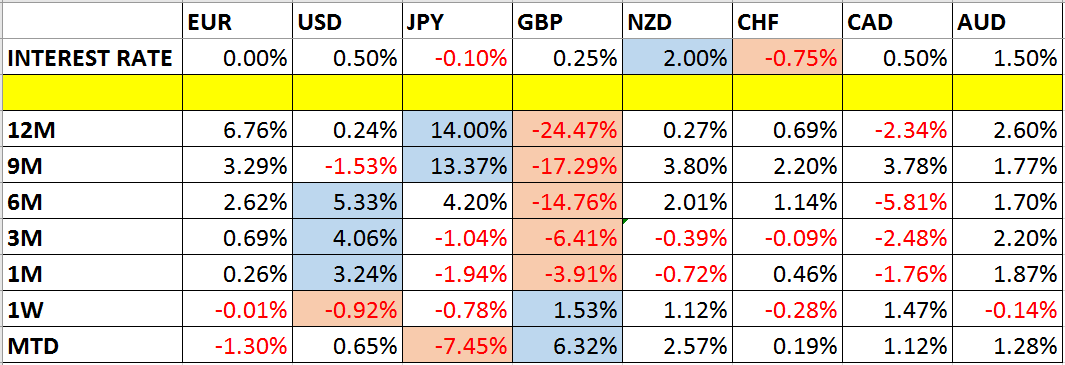 Let’s take a look at the relevant data of currency price changes and interest rates to date, which we compiled using a trade-weighted index of the major global currencies: