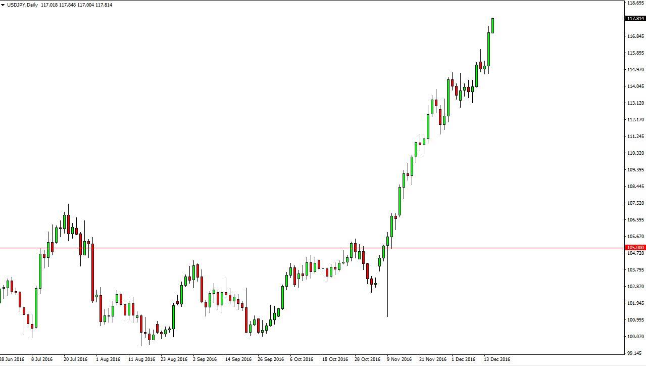 The US dollar rallied against the Japanese yen as we sliced through the 117 level on Wednesday. This was in reaction to Federal Reserve interest rate high expectations, as although the market anticipated the hike on Wednesday, we now know that the central bank is looking to hike several times next year. This should continue to favor the US dollar overall, and at this point pullbacks should be buying opportunities as the Bank of Japan is completely dovish at the moment and as a result I believe that this market will reach towards the 120 handle, probably sooner rather than later. However, I’m the first person to admit that this market is overbought, and we need to find some value on a pull back.
