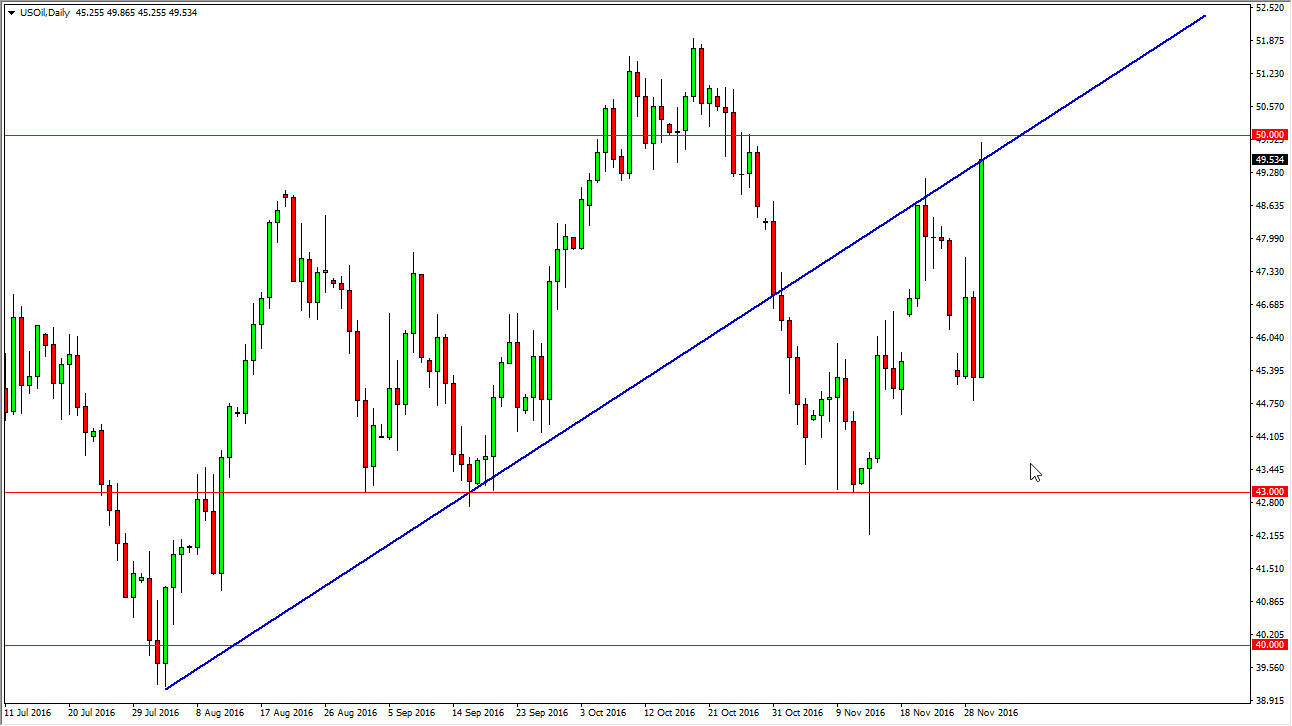 The WTI Crude Oil market broke higher during the day on Wednesday as it was revealed that OPEC had come to an agreement as far as output production is concerned. The production type should help with some of the oversupply, but ultimately I believe that the oversupply is far too much in the way of bearish pressure to be overcome for the longer term. After all, the higher the pricing goes when it comes to the oil market, the more interested the Americans and Canadians will be as far as drilling is concerned. The $50 level above has offered resistance, and of course the bottom of the uptrend line has as well. Because of this, waiting to see whether or not we get some type of exhaustive candle after a failed break out in order to start shorting. I think there is a significant amount of resistance all the way to the $52 handle.