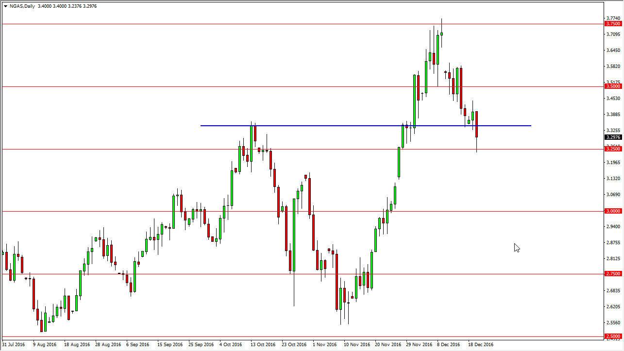 The natural gas markets fell rather hard during the Tuesday session, slicing through the $3.30 level. That was an area that had been supportive in the past, and of course resistance as well. Because of this, the sellers got aggressive and we went all the way down to the $3.25 handle. As an area where I thought there could be buyers, and the fact that we bounced later in the day suggests to me that we will eventually bounce higher and perhaps reach towards the $3.45 level again. On a supportive candle, I’m willing to buy, but I also recognize that a break down below the bottom of the range for the session on Tuesday would be a very negative sign. If that happens, the market should then reach down to the $3.00 level, which of course is a large, round, psychologically significant number.