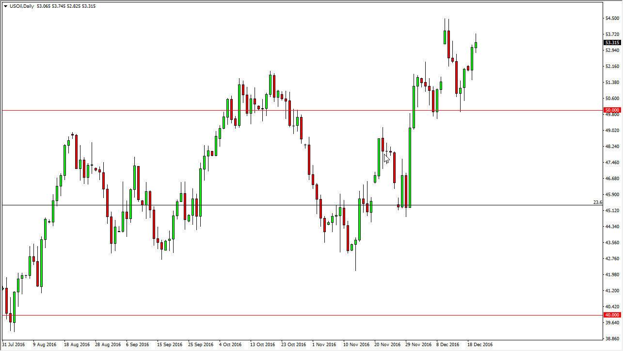 The WTI Crude Oil market had a slightly bullish candle on Tuesday, as we continue to grind towards the highs. I think that somewhere near the $55 level we will begin to see quite a bit of resistance. If we can break above the $55 level, the market should continue to go much higher. In the meantime, I am willing to buy pullbacks every time we see some type of supportive candle, all the way down to the $50 handle. If we were to break down below there, then I think that the WTI market will fall significantly. We do have the Crude Oil Inventories announcement coming out today, so expect volatility.