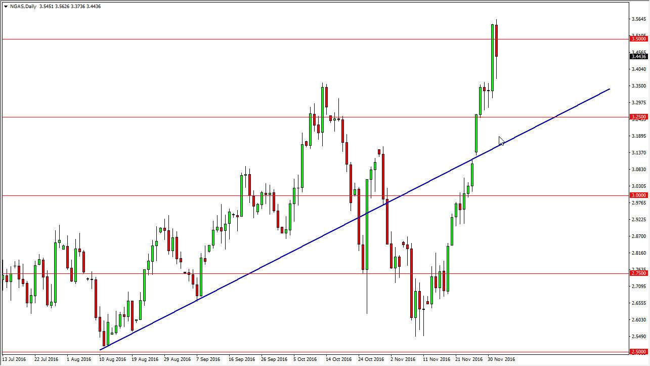 The natural gas markets pulled back quite drastically during the day on Friday, but only long enough to find support at the $3.35 handle. I suspect that the E3 $.35 level should be supportive, considering it was so resistive in the past. Because of this, the move makes sense that we are still overbought by just about any metric measure this market by. Because of this, I still prefer to see more of a pullback before getting involved, but recognize that selling is almost impossible at this point.