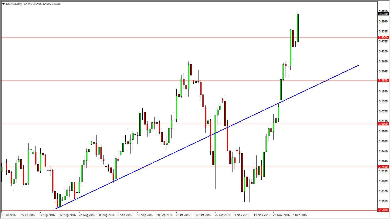 Natural gas markets exploded yet again during the day on Monday, as we have reached above the $3.60 level. That’s an area that serves no real significant resistance, so I think that the market is probably going to continue to go higher in the short-term. However, we are far overbought, so it’s almost impossible to continue the upward move at this rate. We desperately need a massive correction, and we obviously haven’t had it yet. I think sooner or later we will, and the previous uptrend line would be an excellent place to see a supportive candle after that in order to go long. The $3.50 level should be supportive as well though, so a short-term pullback to that area could offer short-term buying opportunity. I’ve no interest in selling currently, although I do recognize that longer-term we will see massive resistance above that derives itself from the oversupply of natural gas longer term.