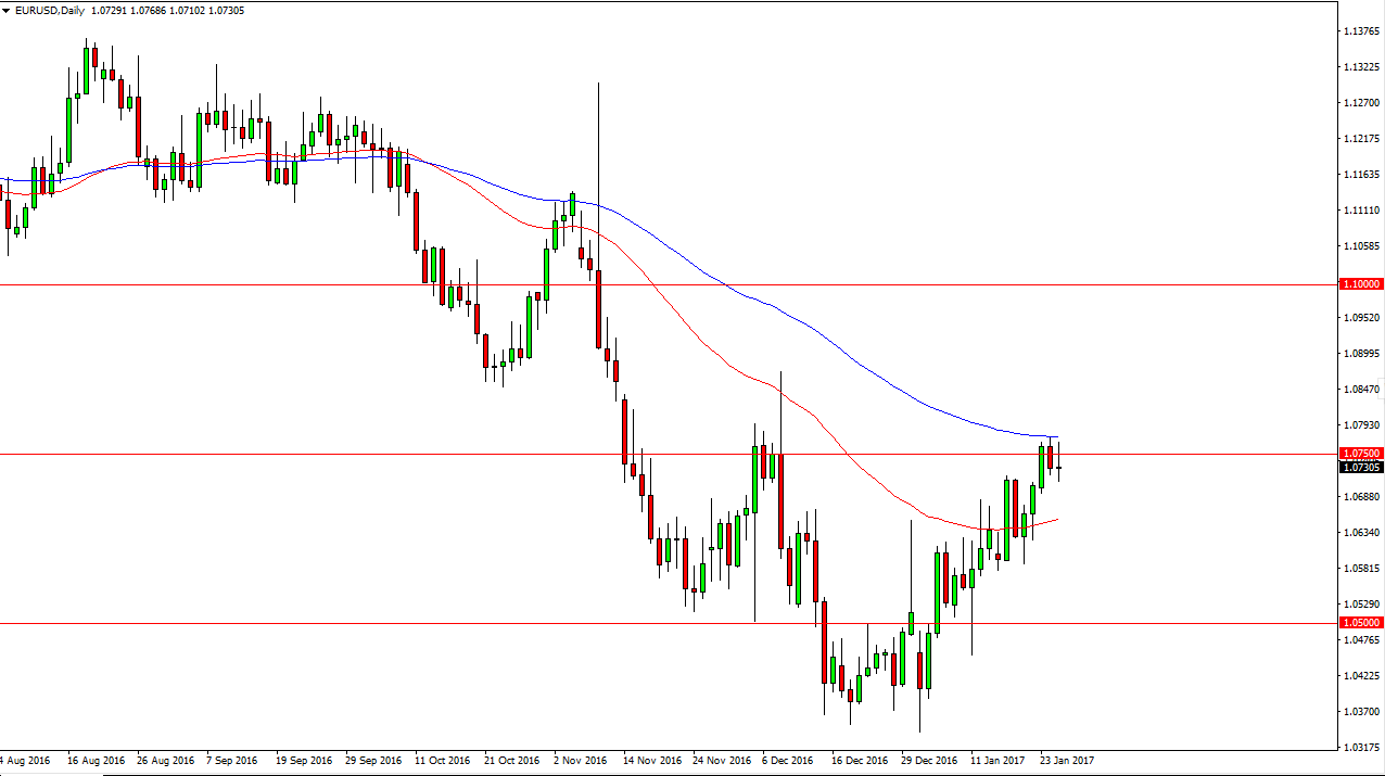 The EUR/USD pair initially rallied on Wednesday, but found quite a bit of resistance above the 1.0750 level, and just as importantly, the 100-exponential moving average. The shooting star like candle suggests that we are getting ready to roll over and I think if we can break down below the bottom of the candle during the day on Wednesday should send this market much lower. The market should then reach down to the 1.06 handle, and then eventually the 1.05 handle. At this point, if we can break above the top of the shooting star and of course the 100-exponential moving average, I think that the market then could go to the 1.09 level and possibly even the 1.10 level after that.