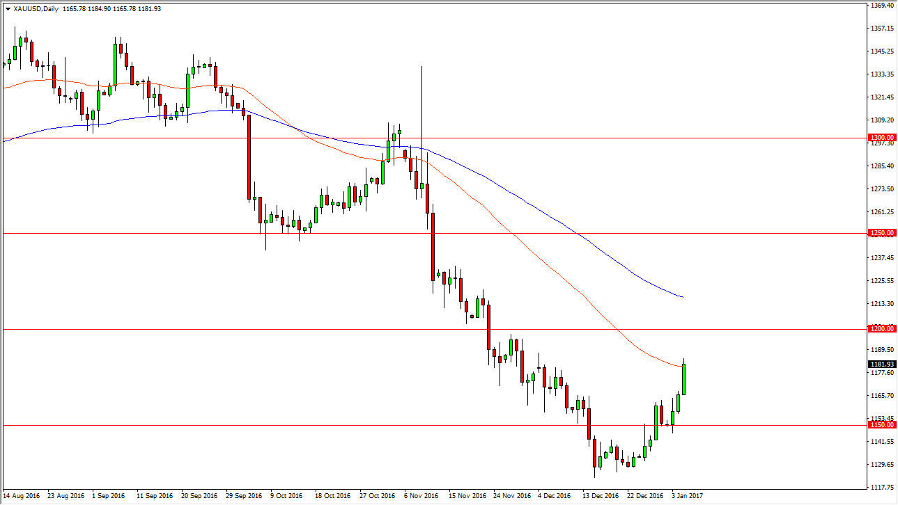 Keep in mind, the jobs number surprising to the upside could put a lot of upward pressure on the US dollar, which by extension puts a lot of downward pressure on the gold markets. On the chart, I have the 50-day exponential moving average colored in red, and you can see that the market is currently testing that area. Above there, we have the blue 100-day exponential moving average, which of course is also followed by longer-term traders.