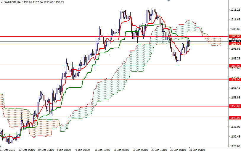 The market challenged the 1200 level yesterday level but failed to break through. As a result, prices returned to the 1195 area. Yesterday's advance pushed prices above the Ichimoku clouds on the H1 and M30 time frames, plus the Tenkan-sen (nine-period moving average, red line) and the Kijun-sen (twenty six-period moving average, green line) lines are positively aligned on both time frames. In other words, the short-term charts suggest that XAU/USD is likely to pay another visit to this barrier.