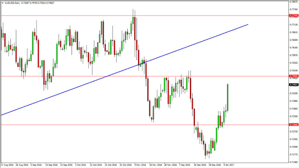 The Australian dollar showed a certain amount of stubbornness during the day on Wednesday, as we broke down to the upside and screamed towards the 0.75 handle. That’s an area that is massively resistive though, so be interesting see whether or not we can sustain this type of move. I suspect that we won’t be able to, and an exhaustive candle near the 0.75 level is an excellent selling signal from what I can tell. However, I do recognize that if we break above the 0.7530 handle on a four-hour close, then you have to think that were going to try to reach towards the previous uptrend line which gives is market quite a bit of room to move. At this point though, I believe that the gold and Australian dollar market will eventually run out of momentum.