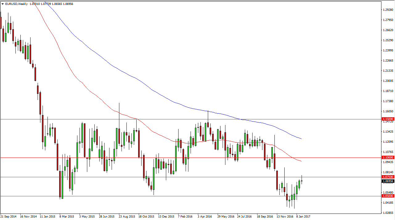 The EUR/USD pair trying to break above the 1.0750 level during the week, but struggled and turned around to form a shooting star on the weekly chart. Because of this, if we can break down below the range for the week, I feel that this pair is probably going to go down to the 1.05 handle next. Alternately, a break above the highs of the week should send this market looking for the 1.09 level.