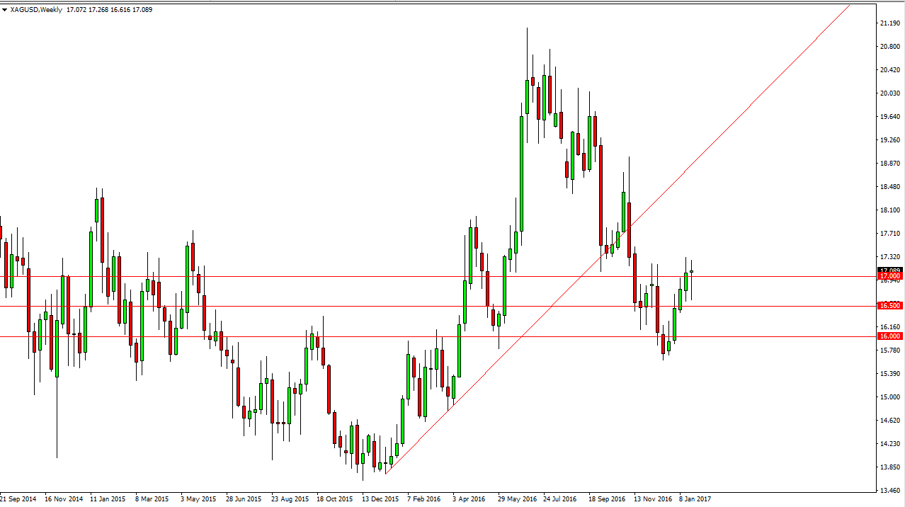 Silver markets ended up showing real strength by the end of the week, as we had initially reached towards the $16.50 handle. By forming a massive hammer that sits just above the $17 level, silver looks as if it is ready to continue going higher. A break above the highs from the week should send this market towards the $18.50 level over the longer term. Alternately, if we breakdown below the $16.50 level, the market should then go to the $16 level.