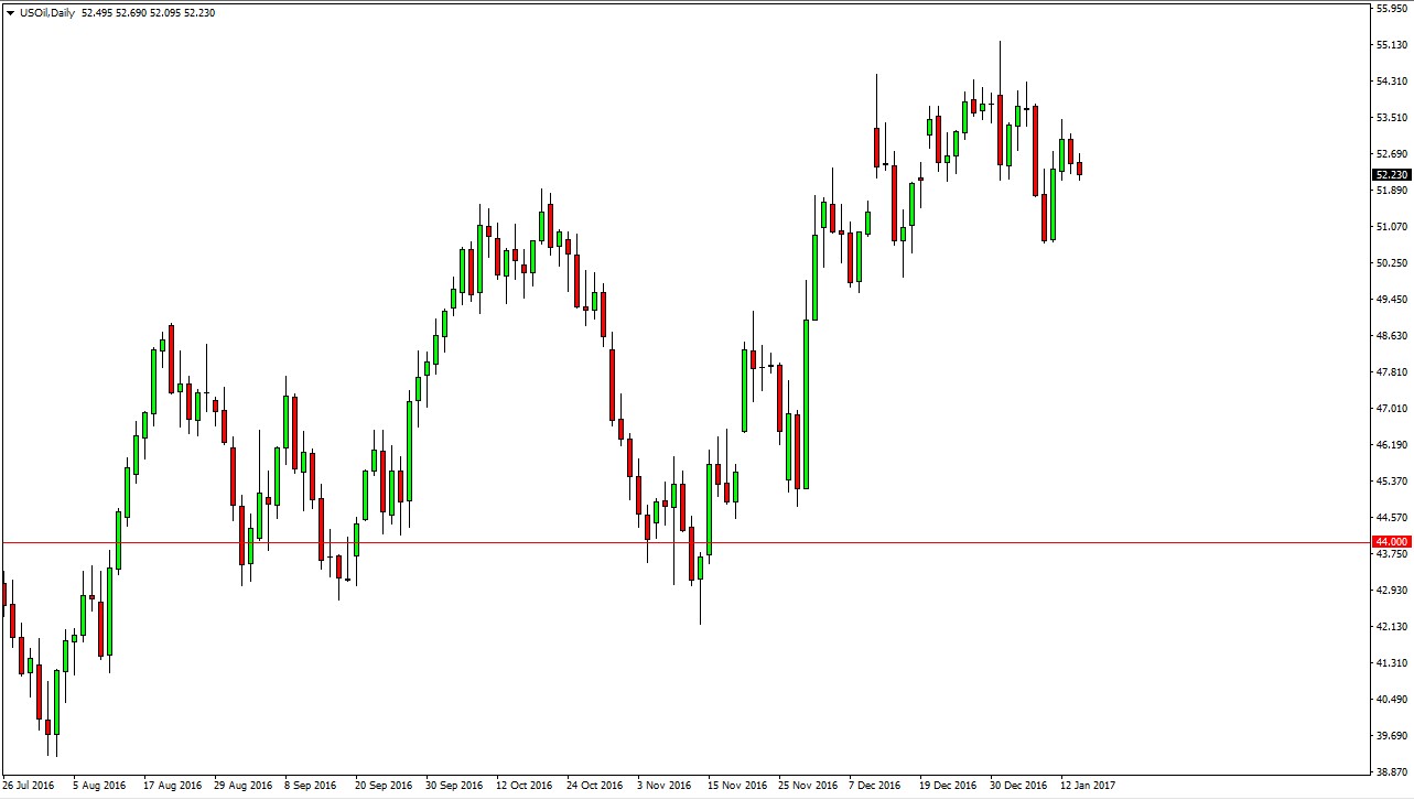 The WTI Crude Oil market fell slightly on Monday as liquidity would have been a serious issue. It was Martin Luther King Jr. day in the United States, which of course is the reason so many Americans would have been away from their electronic terminals. Ultimately though, what I look at is that we are appearing to try to roll over. Because of this, I think the market is going to reach towards the $50.50 level, as the market simply seems to be running out of steam. The market above sees quite a bit of resistance as well, and I think that the idea of noncompliance when it comes to the output production cuts is starting to enter the mind of traders. A strengthening US dollar of course doesn’t help oil either.